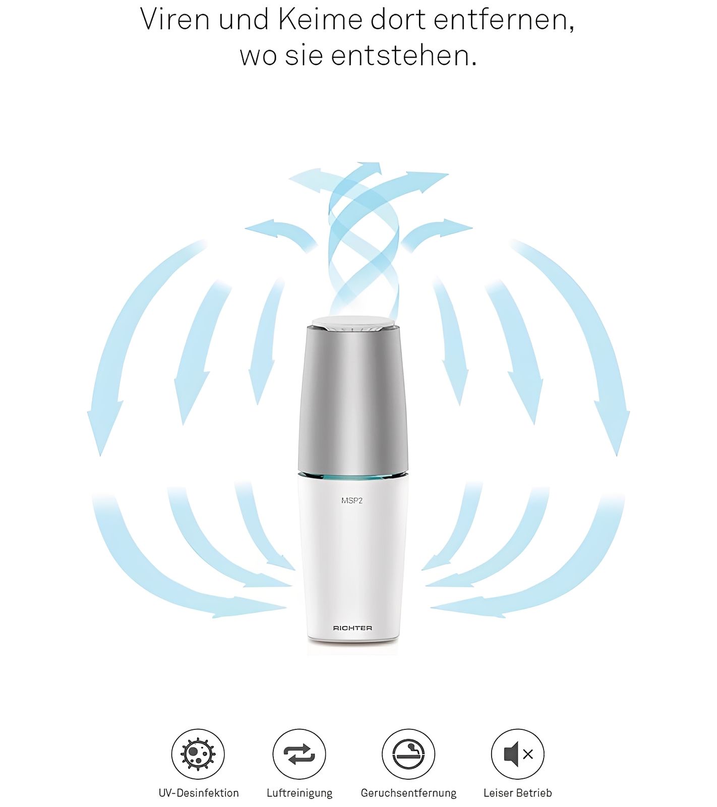 - Mit dem mobilen UV-Luftreiniger MSP1 vernichten Sie Bakterien, Viren, Pilzsporen, Lösemittelreste usw. in Ihrer unmittelbaren Nähe