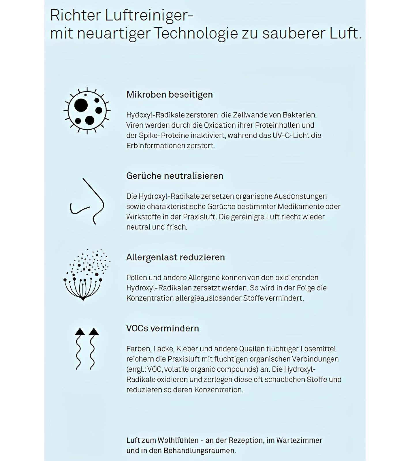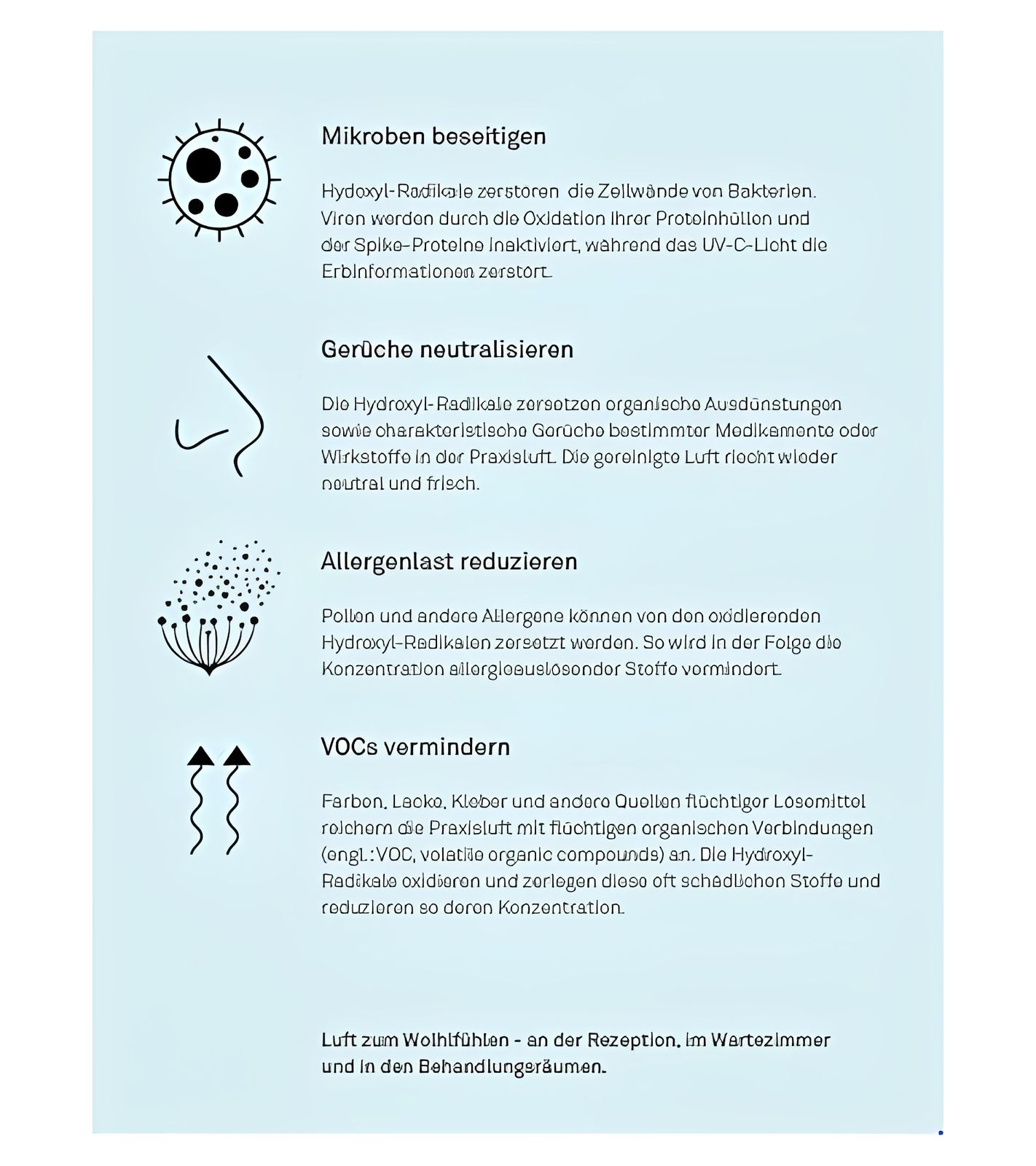- Die erzeugten Radikale vernichten im Innern der Reaktionskammer nahezu alle organischen Bestandteile wie Bakterien, Viren, Pilzsporen, Lösemittelreste, usw.