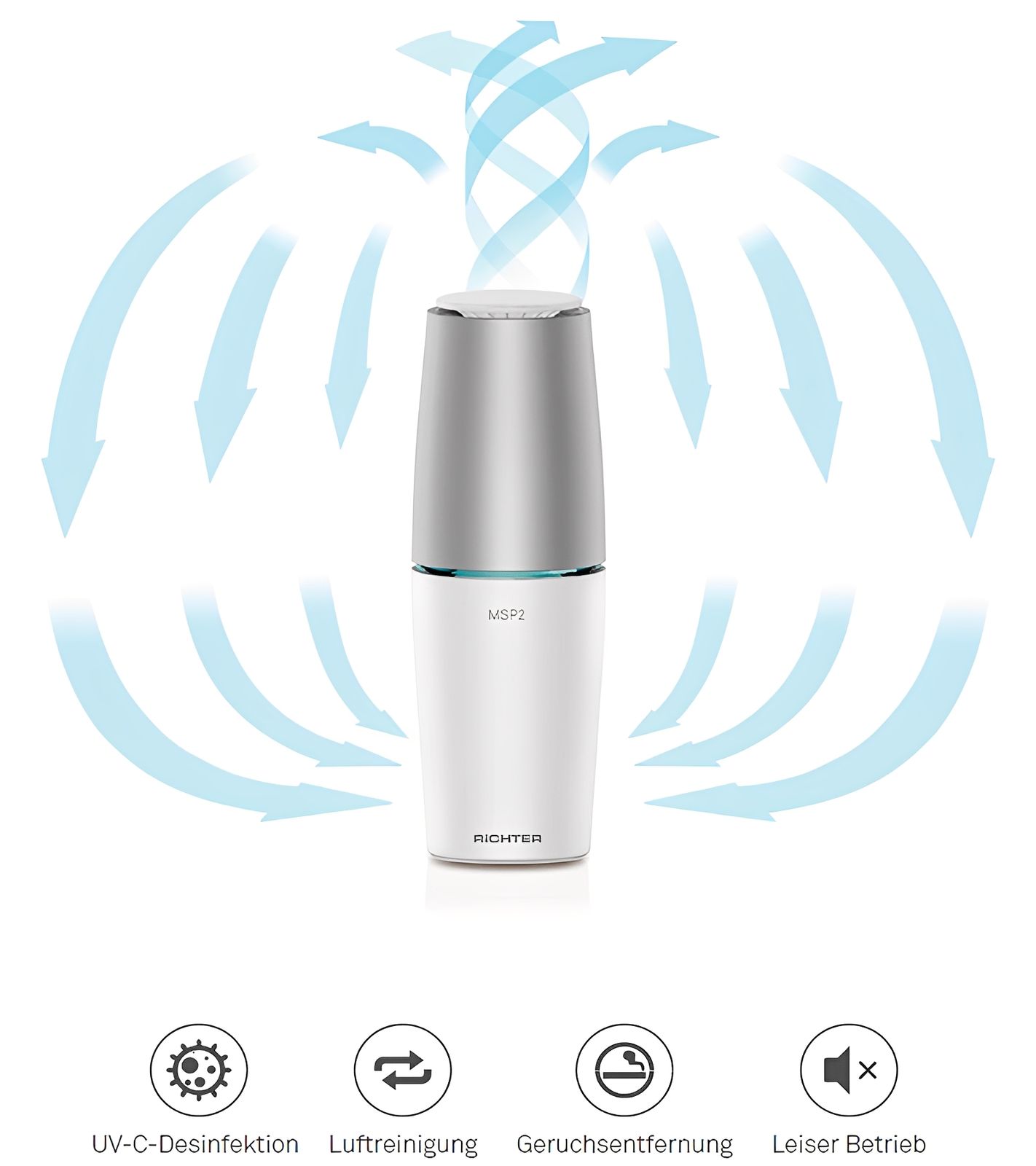 2er Pack RiCHTER UV-Luftreiniger Luftsterilisator UV-Desinfektion Luftreinigung Geruchsentfernung MSP Weiß/Silber Tragbar mit USB-Anschluss oder Stationär mit Netz-Anschluss