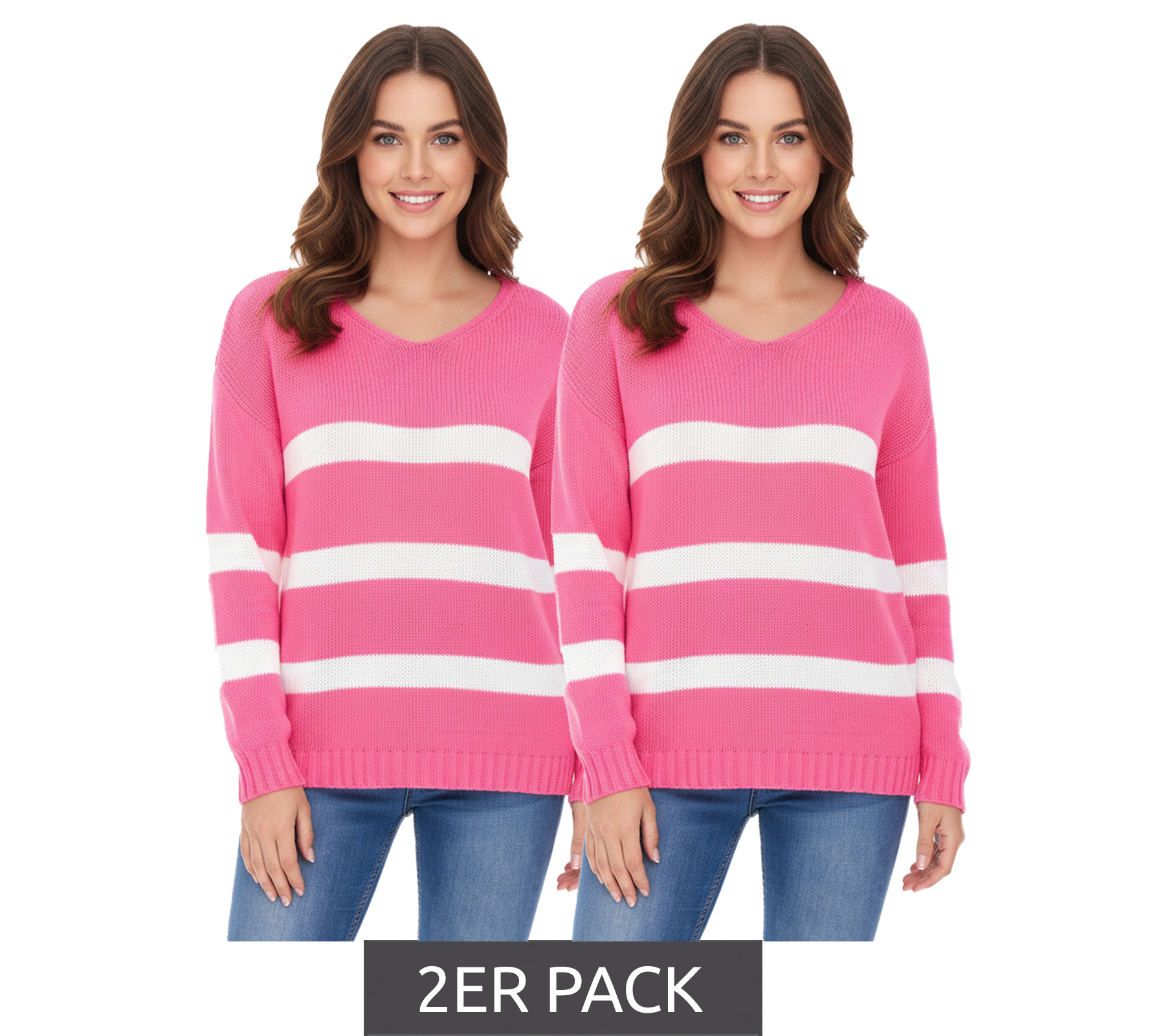 2er Sparpack Aniston CASUAL Damen Strick-Pullover mit Baumwollanteil Alltags-Pullover Langarm-Shirt 39680449 Rosa/Weiß