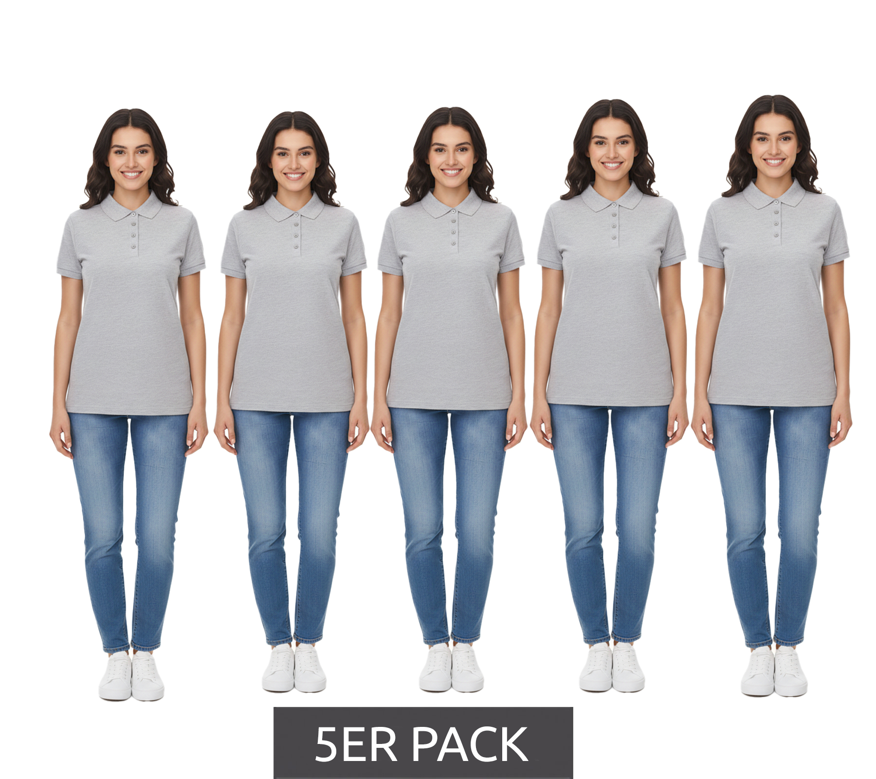 5er Sparpack SANTINO Mika Damen Polo-Shirt aus Bio-Baumwolle Polo-Hemd mit 4er Knopfleiste Kurzarm-Shirt meliert 210 gr/m2 Grau