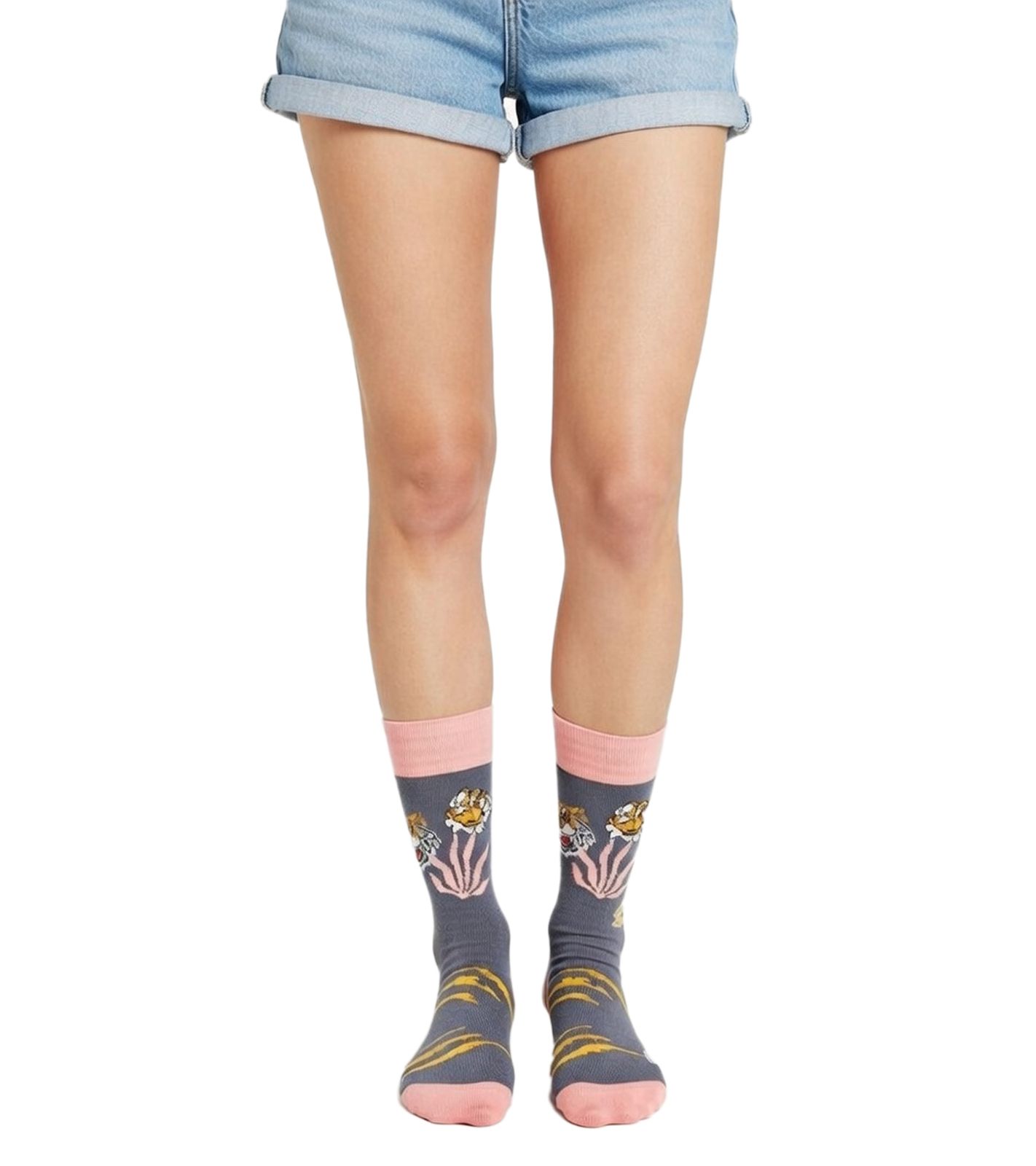 6 Paar Moustard Baumwoll-Socken mit tierischen, blumigen und Retro-Prints gemusterte lange Strümpfe Grau/Grün/Blau/Rosa/Gelb