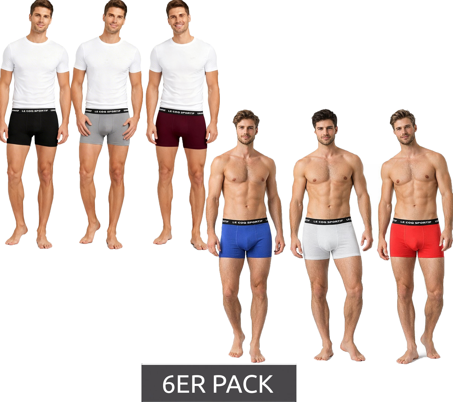 6er Pack Le Coq Sportif Basic Boxer Herren Boxer-Shorts Baumwoll-Unterhose Unterwäsche Grau/Bordeaux/Schwarz oder Rot/Hell-Grau/Blau