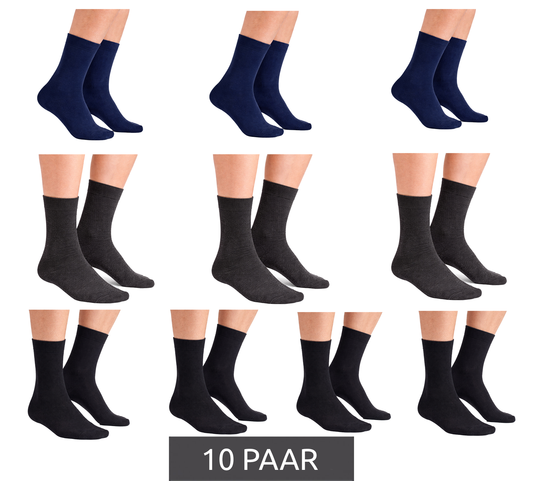 - Lieferumfang: 10 Paar Socken – 4x Schwarz, 3x Dunkelblau, 3x Grau