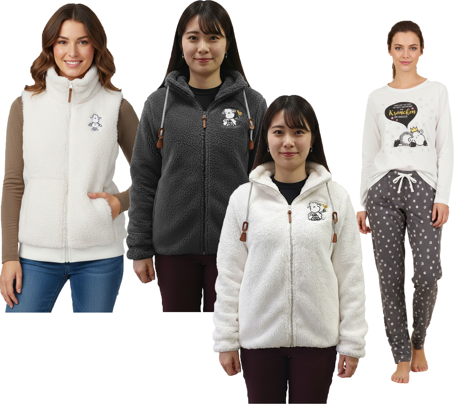 Bequeme sheepworld Damen Teddyfleece-Weste mit gesticktem Motiv Kuschel-Jacke oder Pyjama-Set mit Marken Motiven Weiß oder Grau