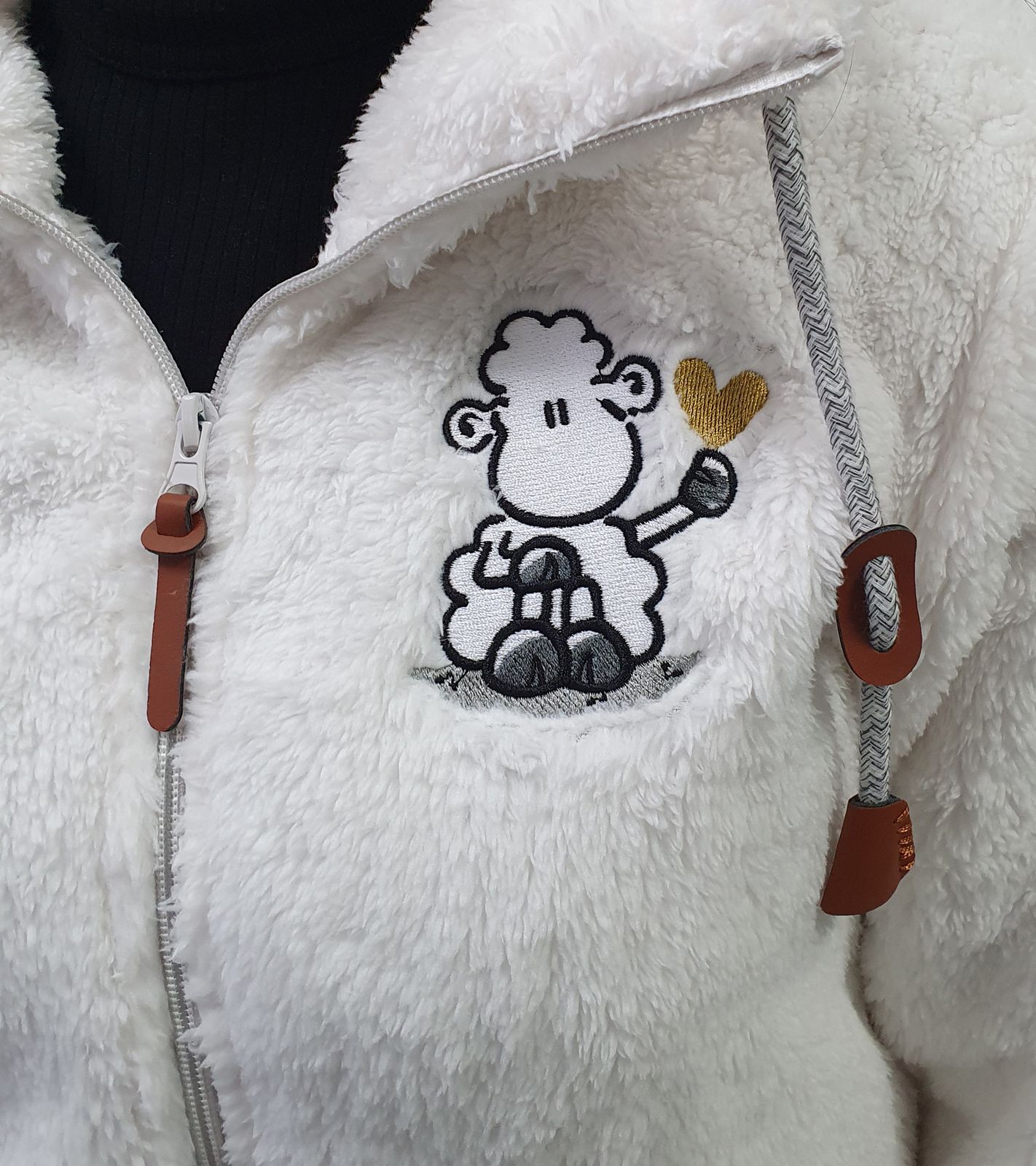 - Mit Leder-Applikationen an Reißverschluss und Kordelzug