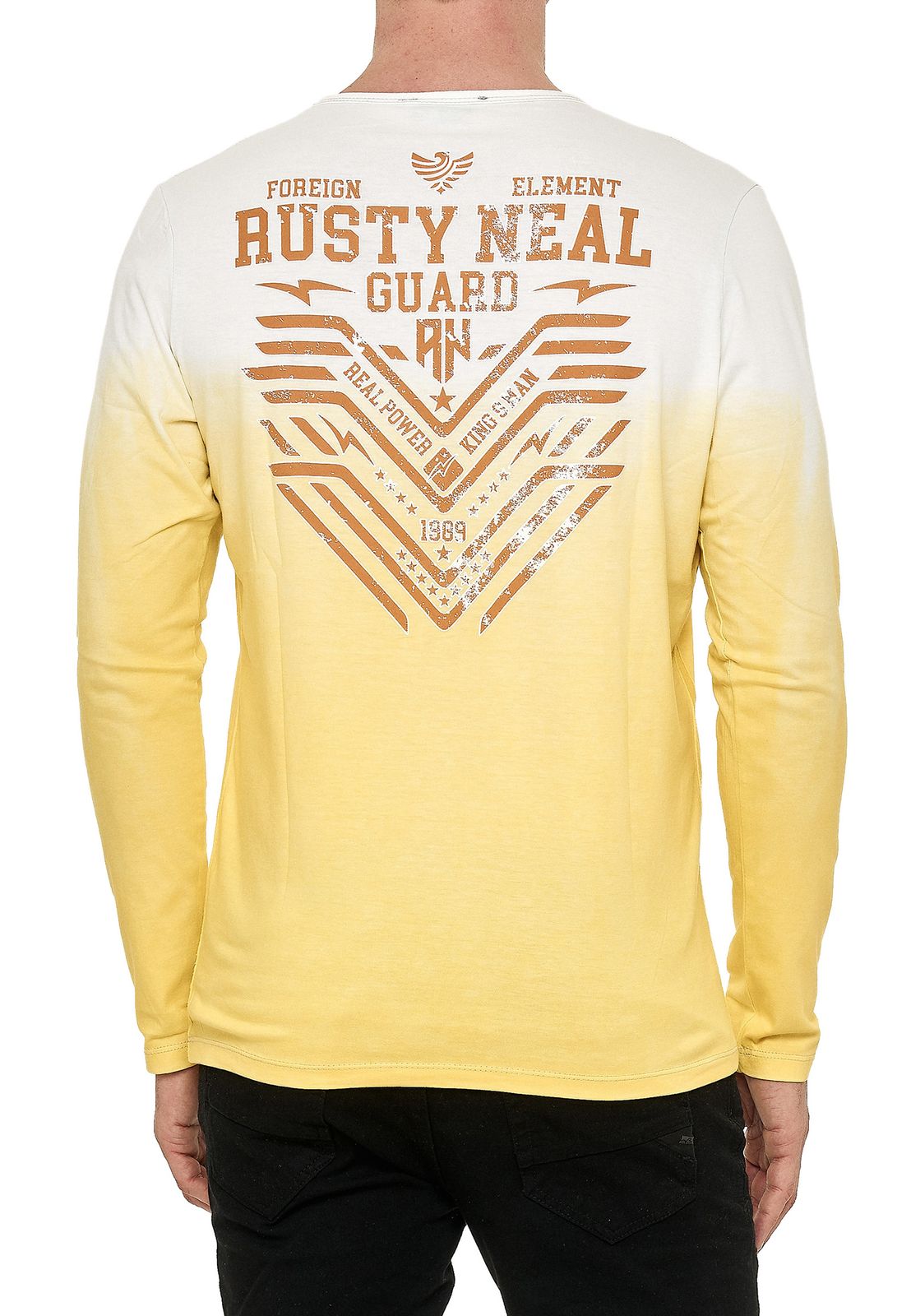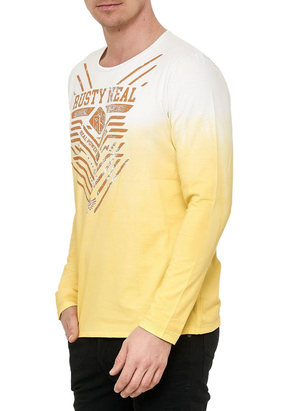Cooles Herren Longsleeve mit Farbverlauf und Frontprint Slim Fit Rundhals Langarm-Shirt im Washed Look 10148 Gelb