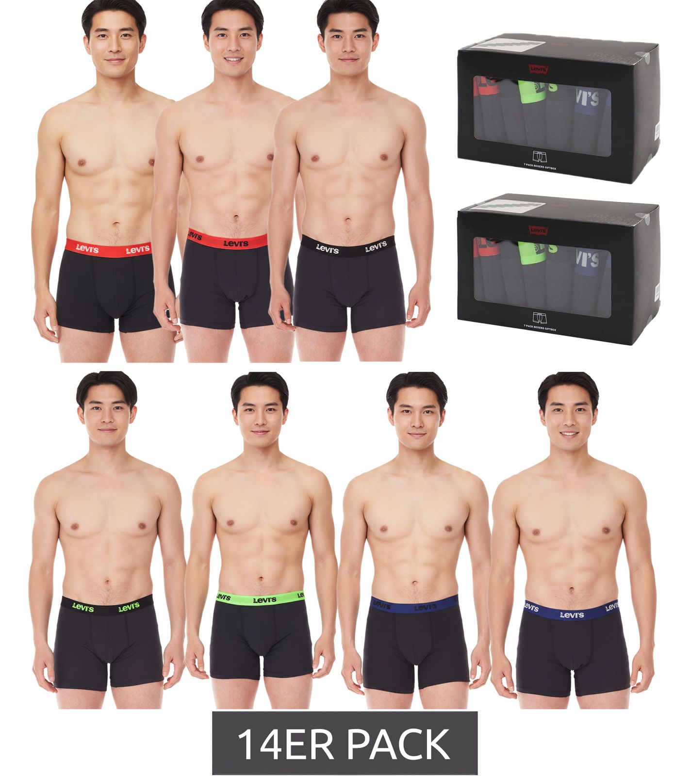 14-pack of LEVI'S men's cotton boxer shorts with colorful accents on the waistband, in a gift box 701225625 001 Black/Green/Blue/Red
