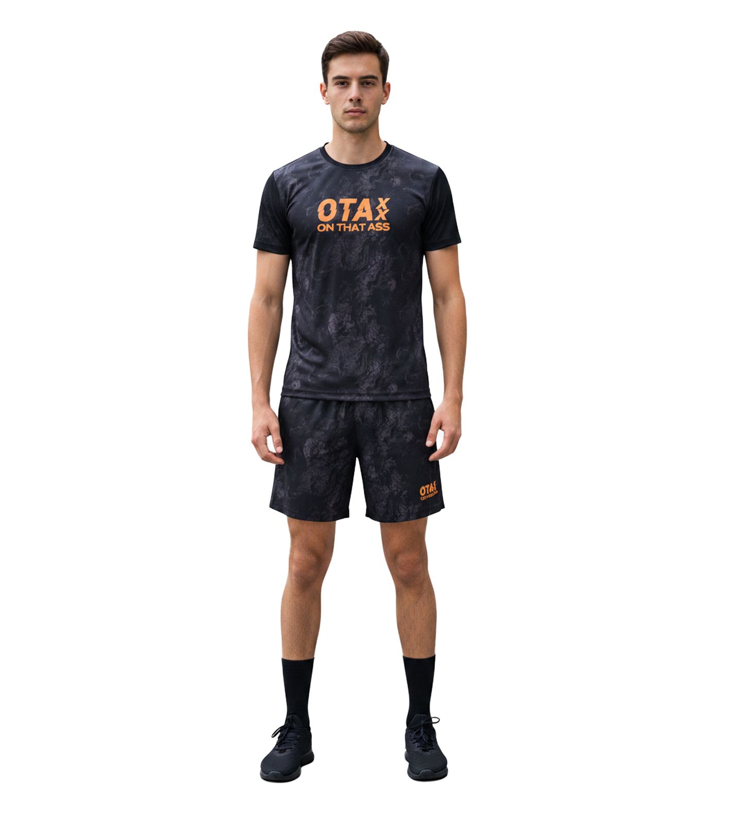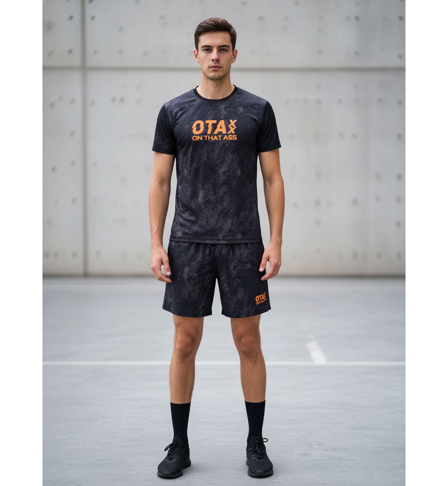 2-Piece ON THAT ASS Team Men's Sports Set - Marble Gym Outfit with T-Shirt & Shorts - Black/Orange