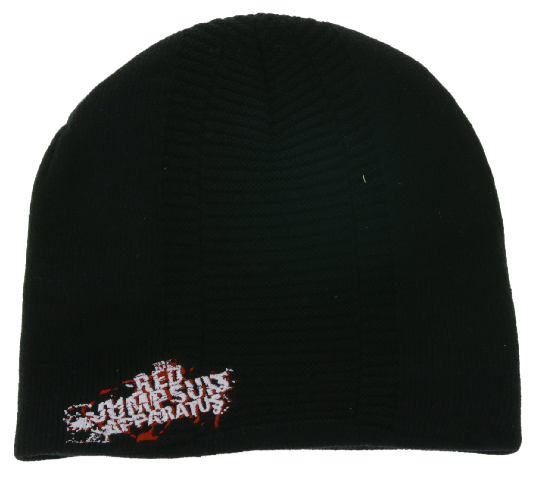The striking red and white "RED JUMPSUIS APPARATUS" logo in a graffiti-style font is prominently embroidered on the front, giving the beanie its distinctive character.