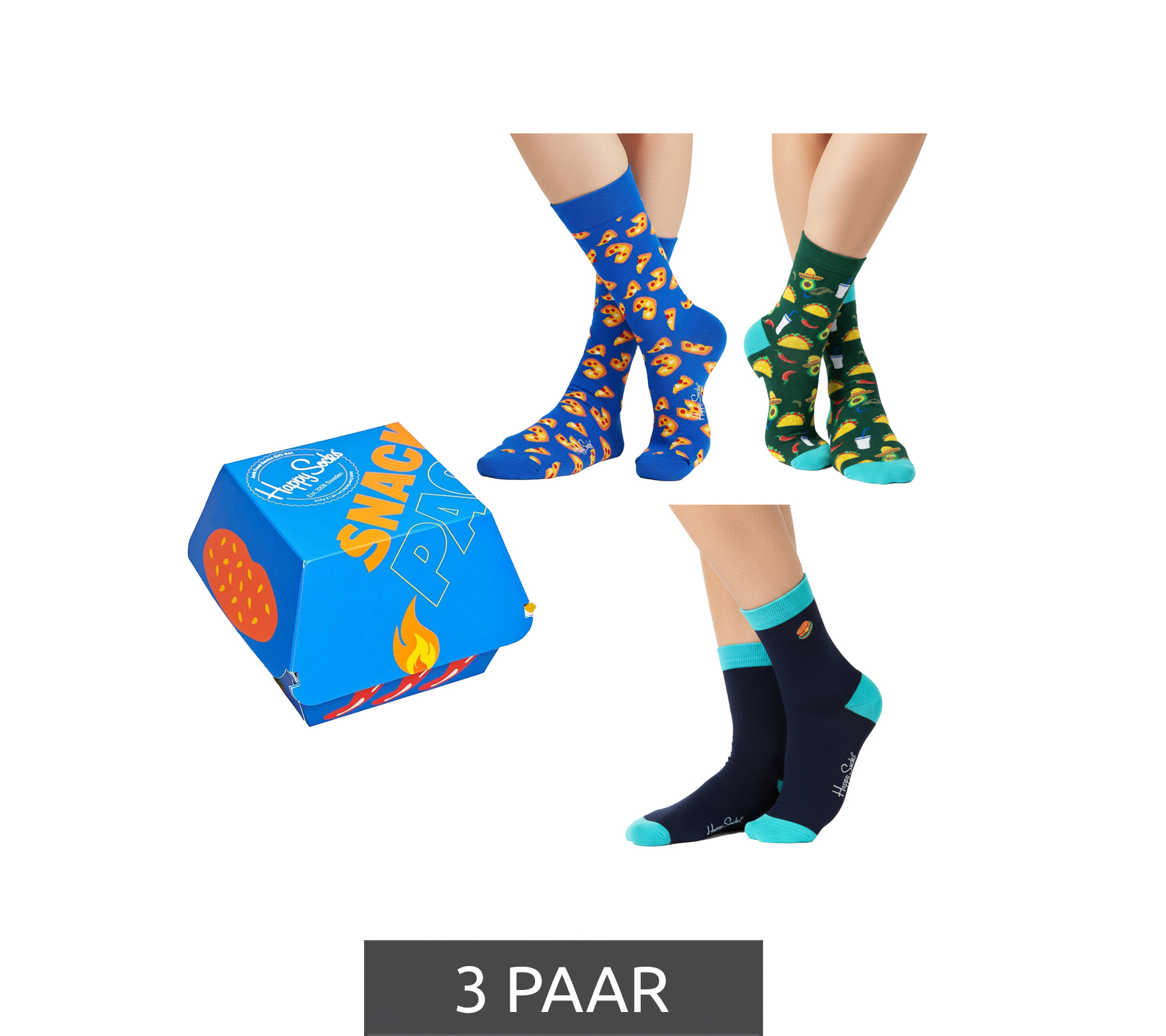 3 Pairs of Happy Socks Junk Food Women's Cotton Socks with Food Motifs Everyday Socks in Gift Box XJUN08-0100 Blue/Green/Multicolor