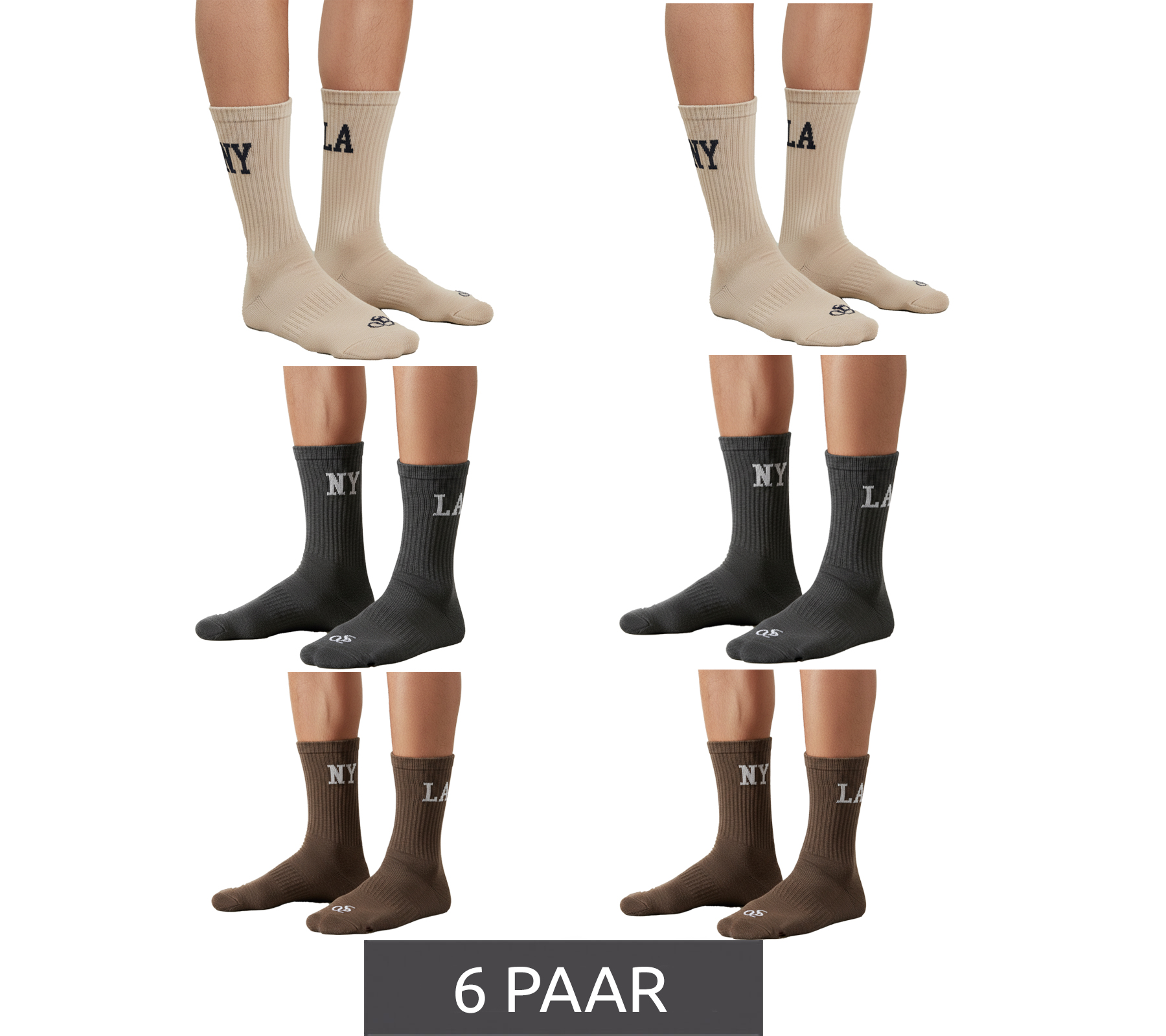 Package includes: 6 pairs of socks (2x Brown, 2x Beige, 2x Dark Gray)