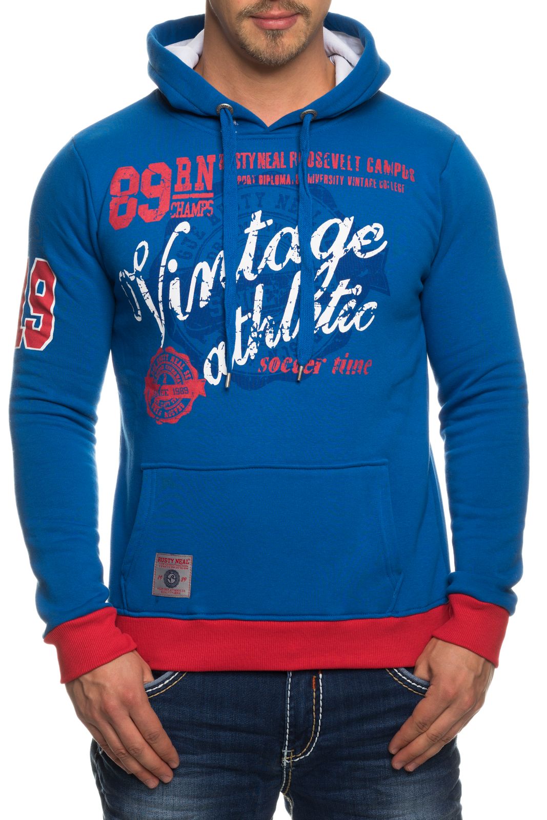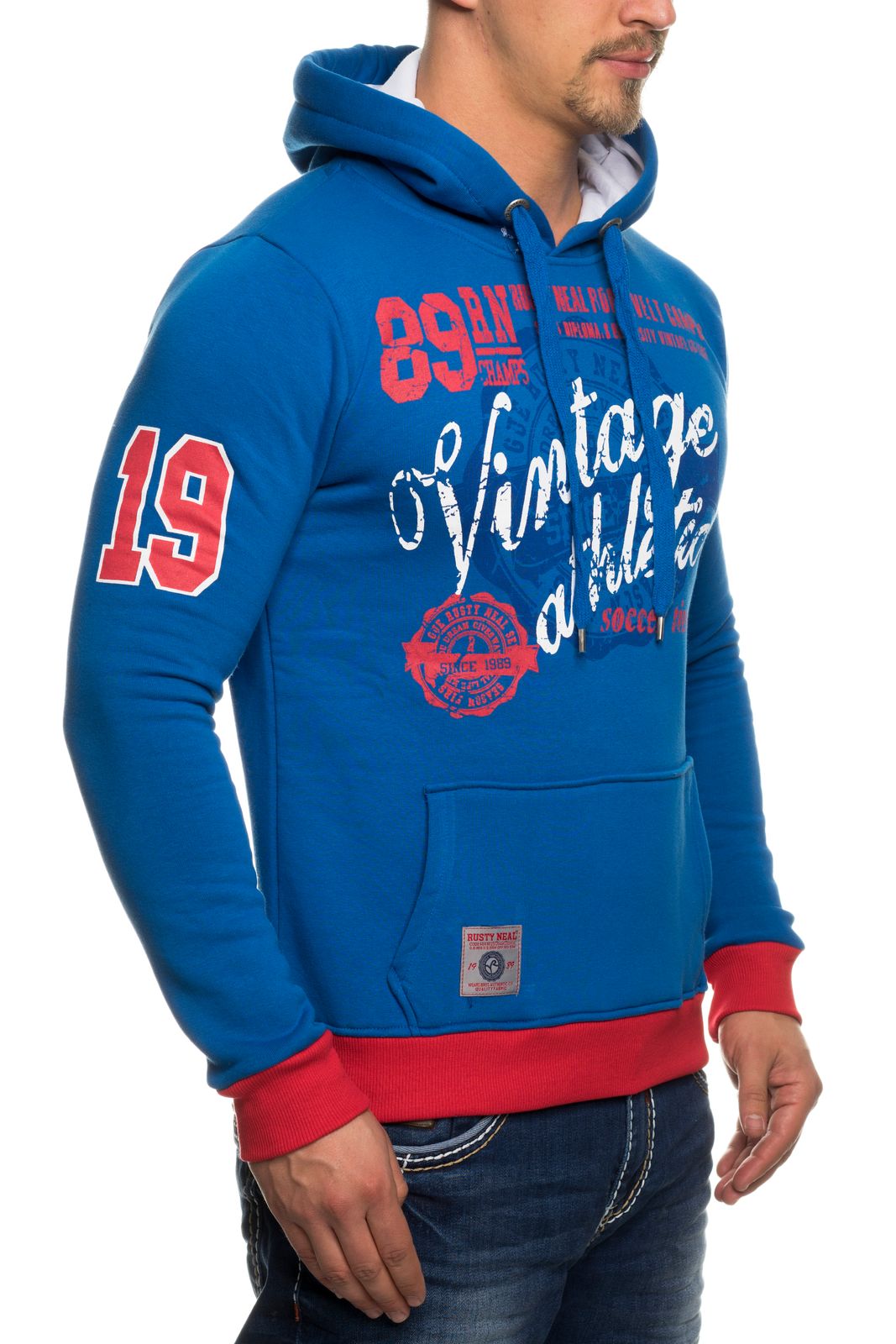 Casual men's hooded sweater with vintage print, kangaroo pocket, hoodie 6870, blue