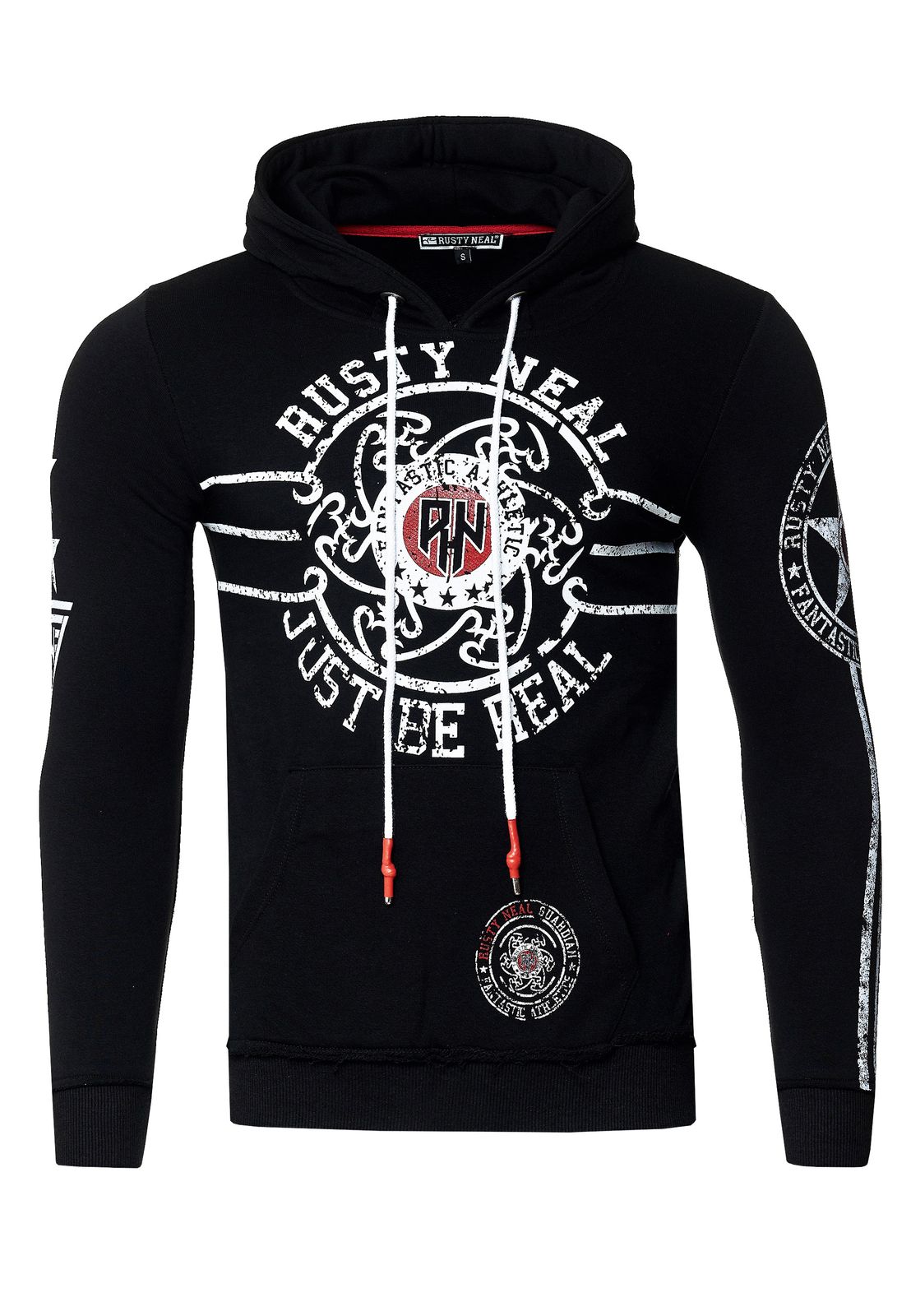 - Trendy men's hoodie in a modern color scheme with striking print accents on the front and sleeves