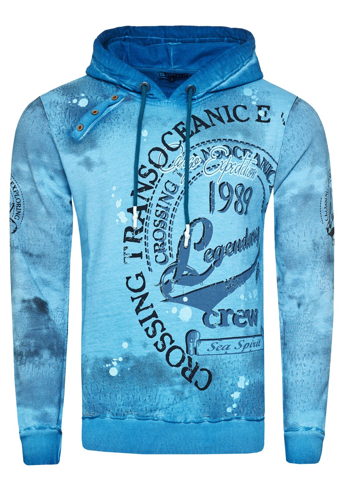 Exclusive men's hooded pullover, oil-washed hoodie with button placket and sea print sweater 19128 Petrol