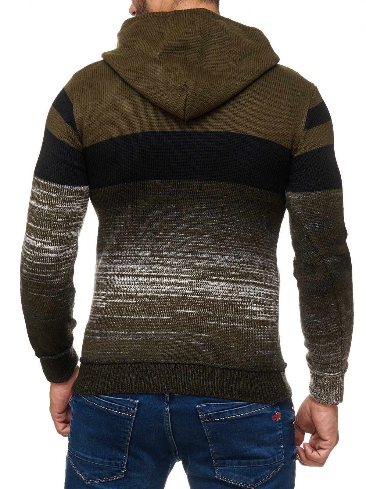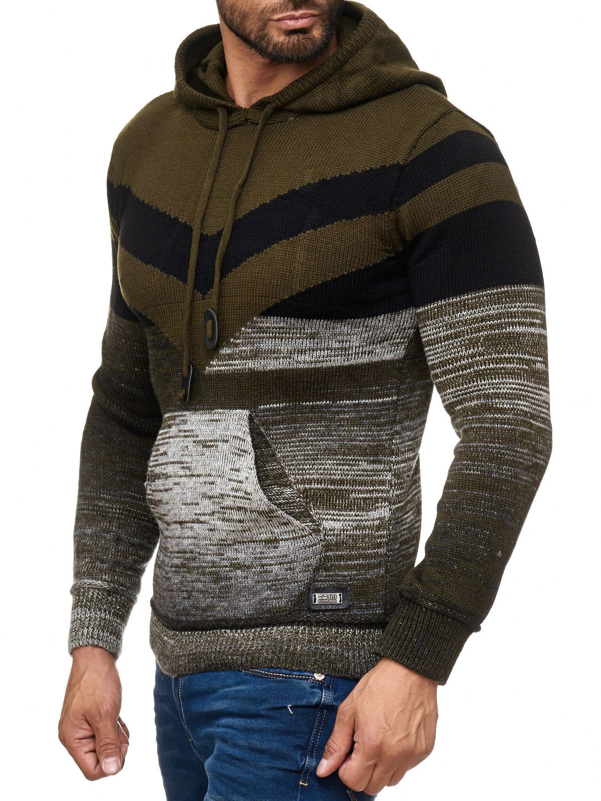 Men's sporty knit hooded pullover in colorblock design, sweater with kangaroo pocket, hoodie 13311 Khaki