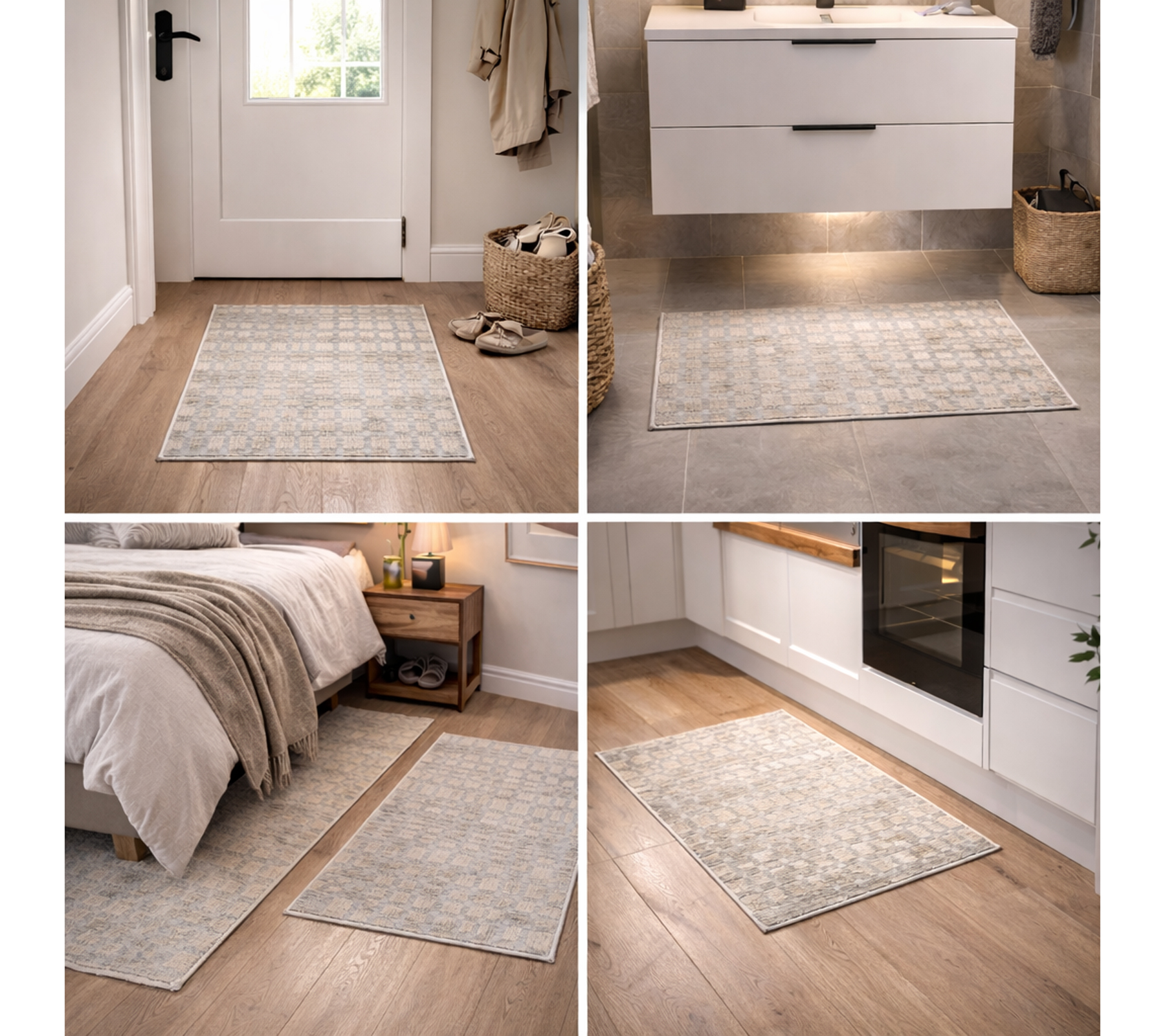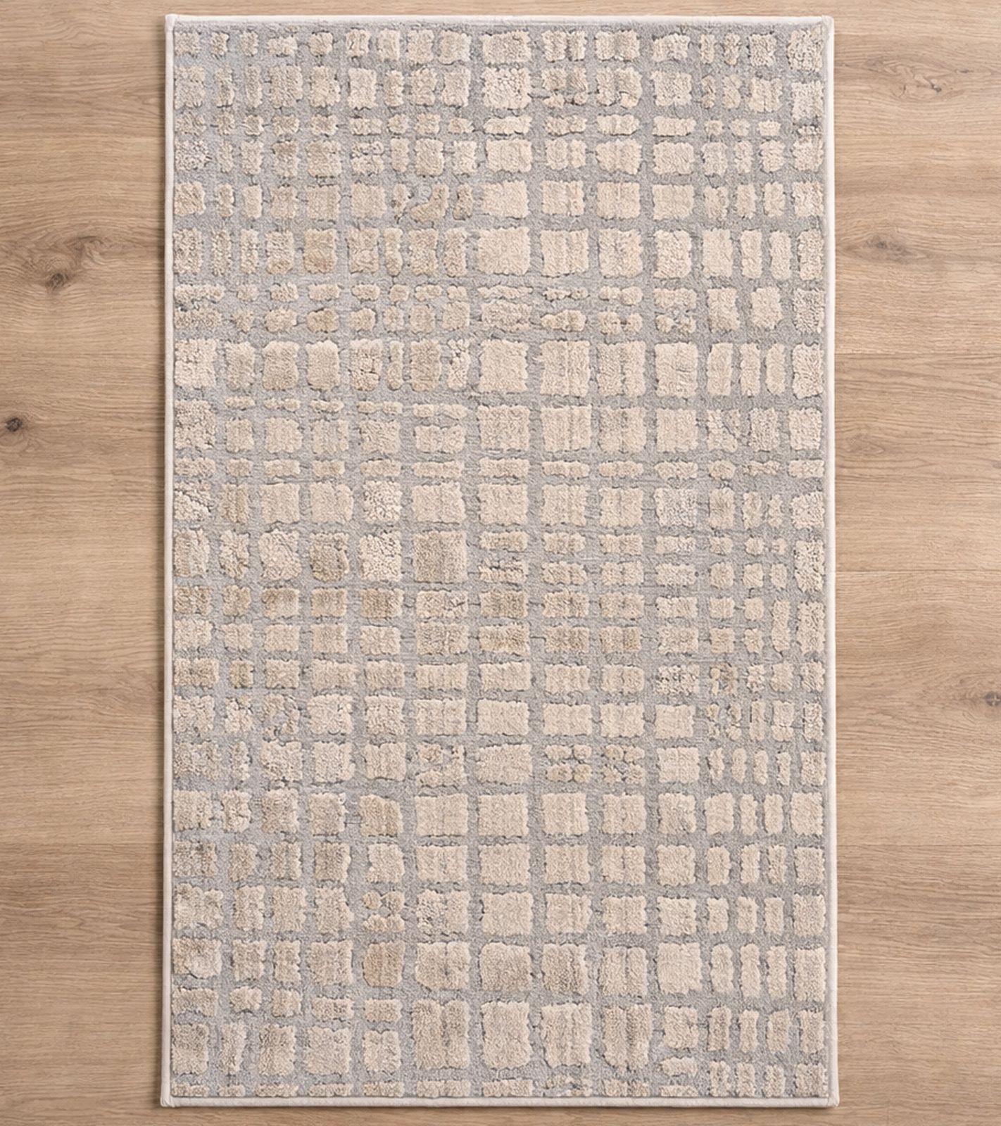 This stylish rug impresses with its modern pattern and harmonious color scheme in beige, cream, and subtle shades of gray. The elegant grid design gives the rug a timeless look and blends perfectly into a variety of interior styles – from modern to Scandinavian.