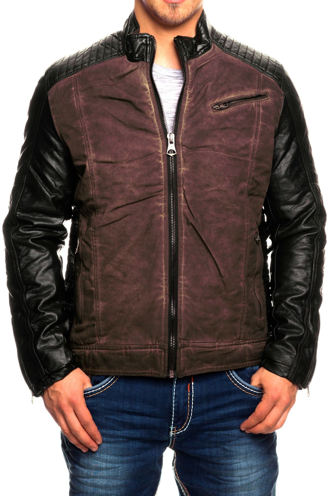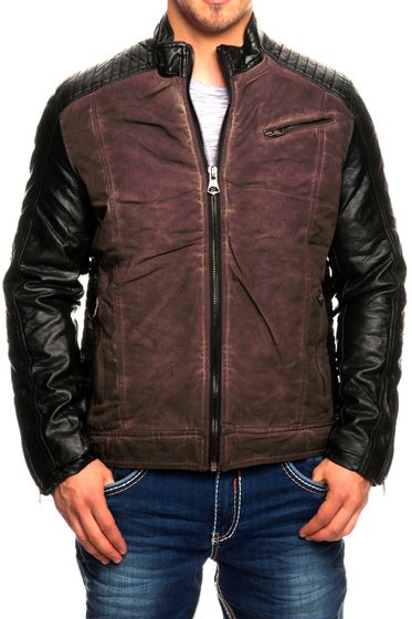 Modern men's biker jacket, washed look, faux leather sleeves, slim fit, transitional jacket, 8833 Bordeaux