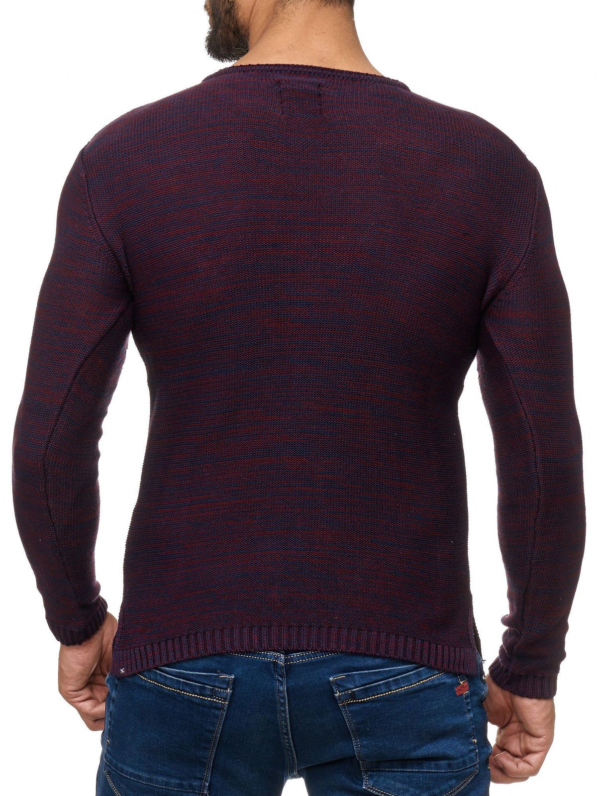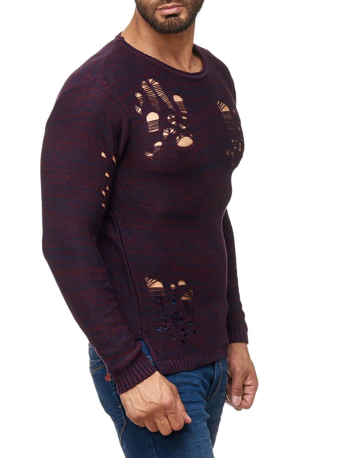 Modern men's knitted sweater in a distressed look, crew neck sweater 13295, wine red