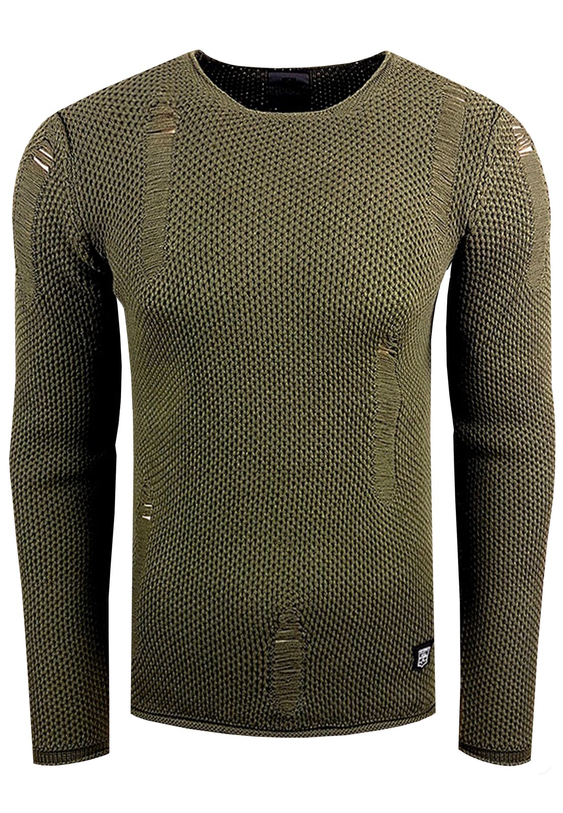 Modern men's knitted sweater in a distressed look, slim fit, crew neck sweater with textured knit, 13249 Khaki