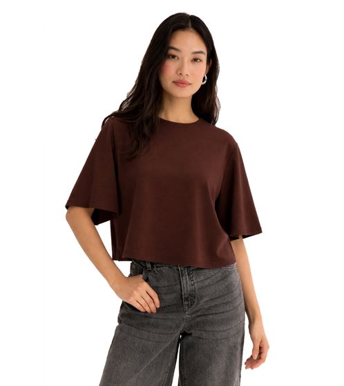 Modern women's t-shirt made from high-quality Punto di Roma fabric. The fashionable oversized design with a cropped length and extended short sleeves creates a casual yet elegant look. A discreet zipper at the back makes it easy to slip on and off and adds a stylish touch. Perfectly paired with high-waisted jeans, skirts, or trousers for a modern outfit.