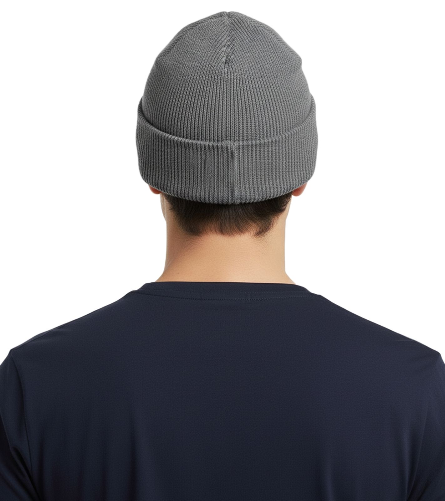 - Ribbed knit structure with a folded brim and a woven brand label on the front