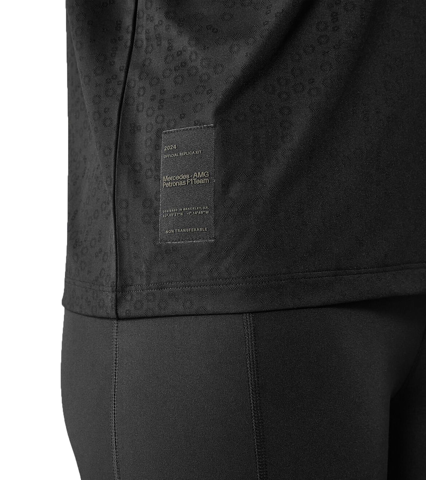 The women's version features the same tonal hexagonal print as the entire 2024 team collection, along with all the official team and sponsor logos of the 2024 Formula 1 season.
