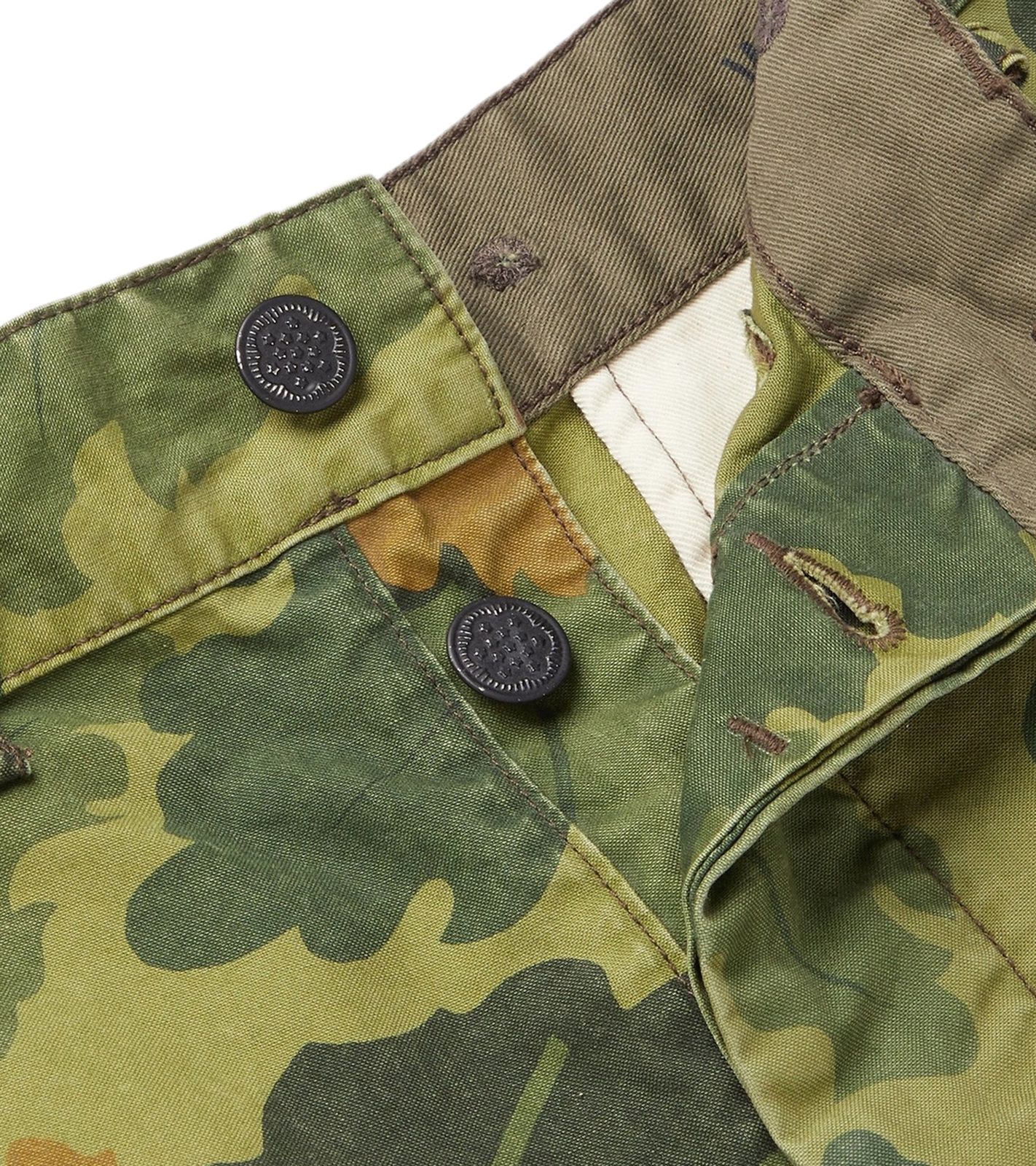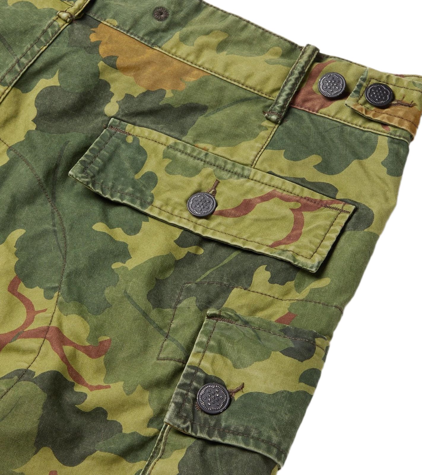 - Two large flap pockets on the thighs with button closures