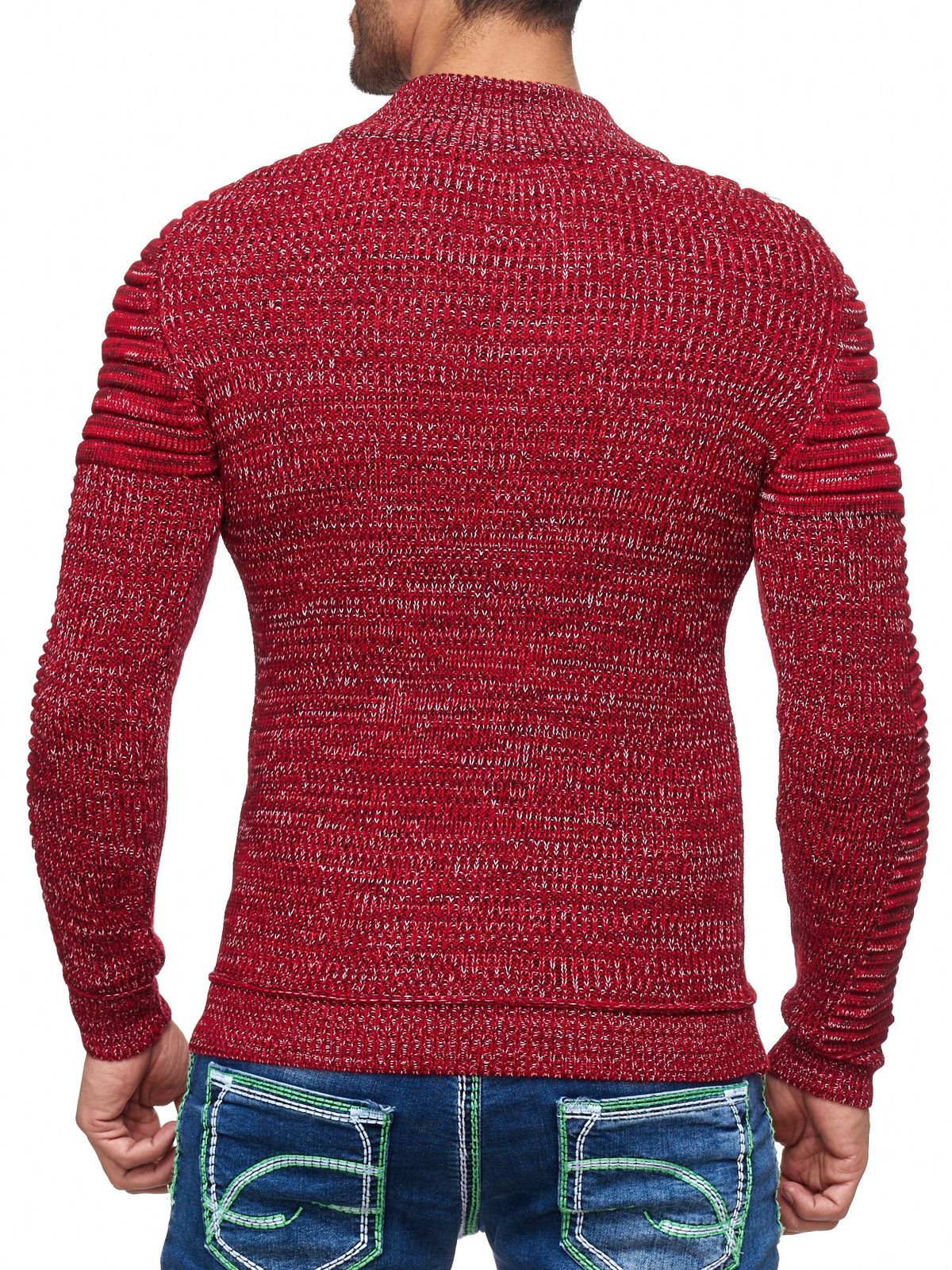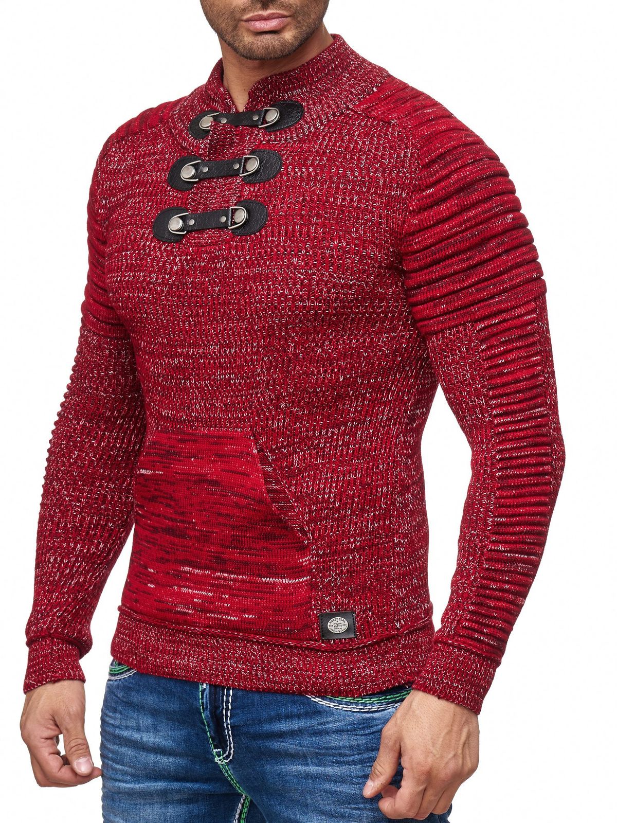 Striking men's chunky knit sweater with stand-up collar and collar closure. Textured knit sweater 13299 Red