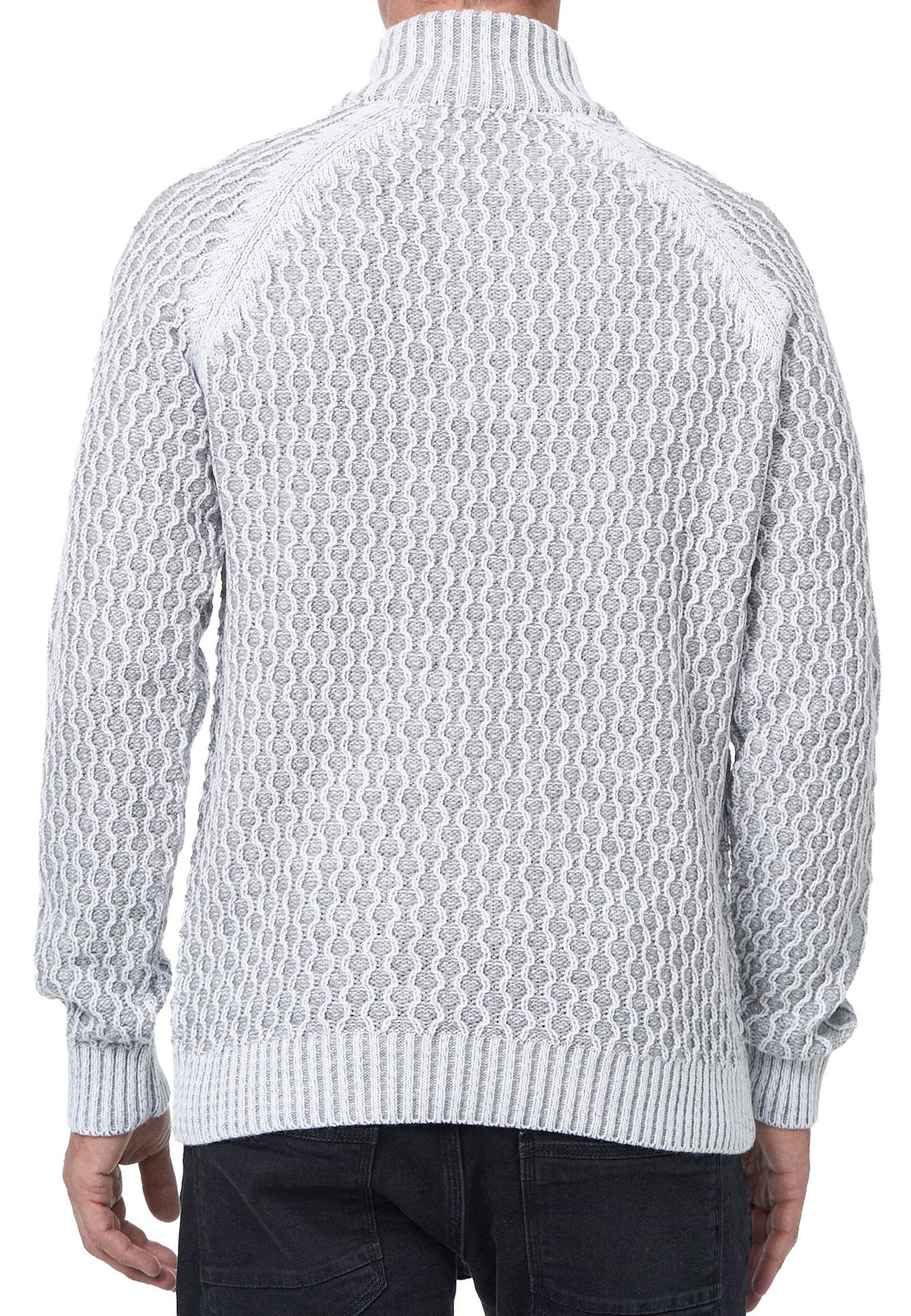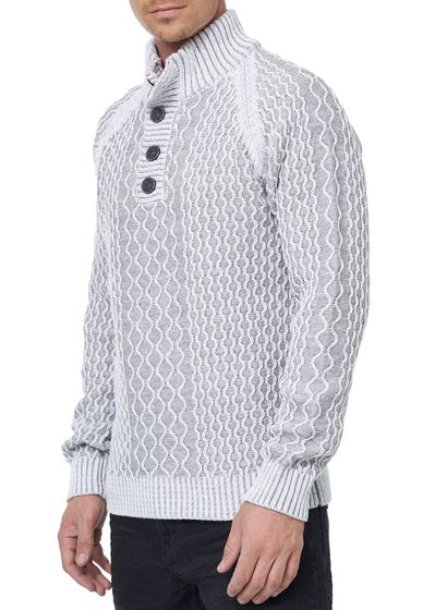 Striking men's knit sweater with stand-up collar and button placket. Contrast sweater in textured knit. 13394 White