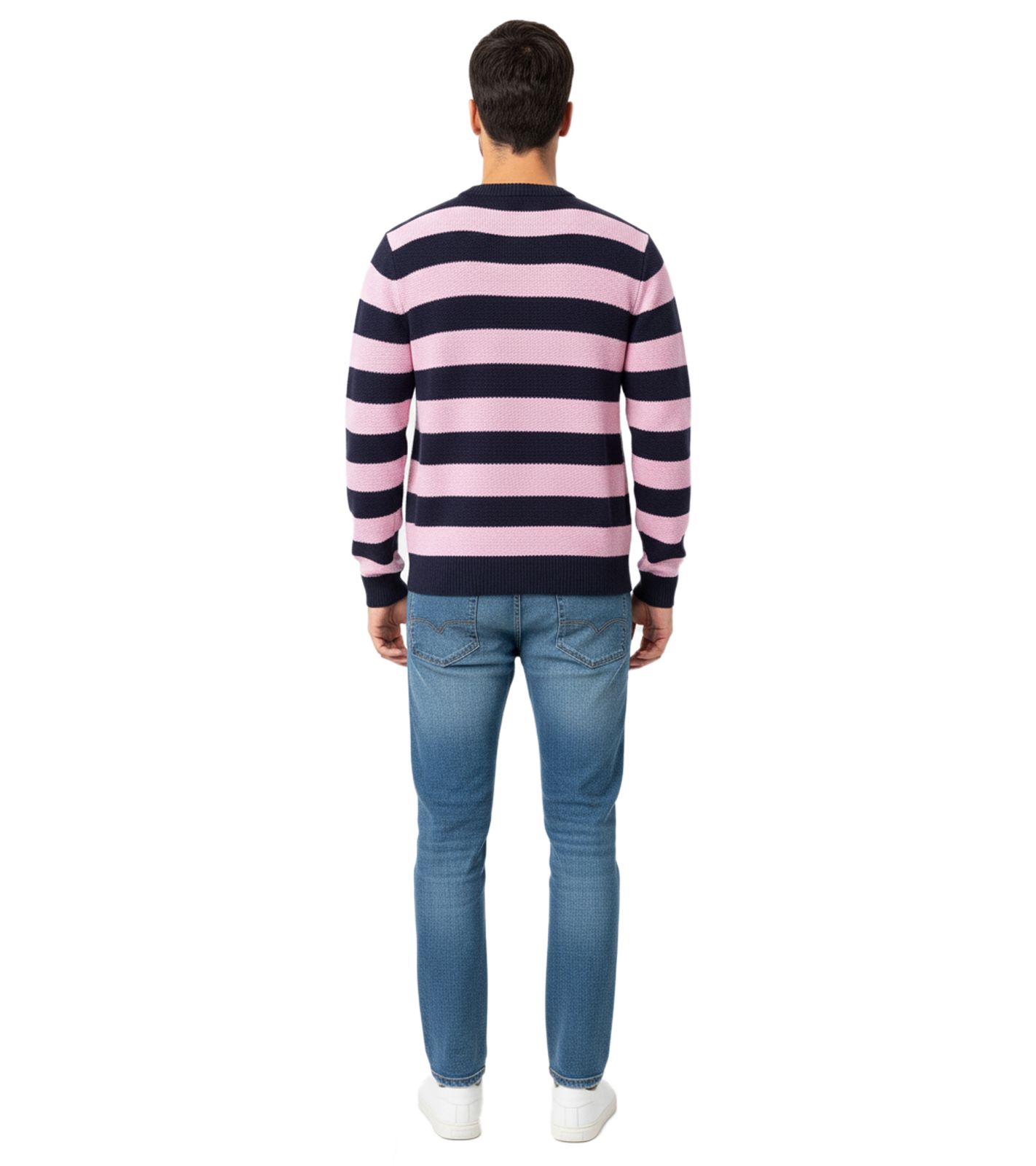 Stylish ESPRIT Men's Striped Knit Sweater, Crew Neck, Cotton Pullover, Dark Blue/Pink