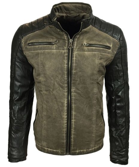 Stylish men's biker jacket, washed look, faux leather sleeves, slim fit, transitional jacket, 8834 Khaki