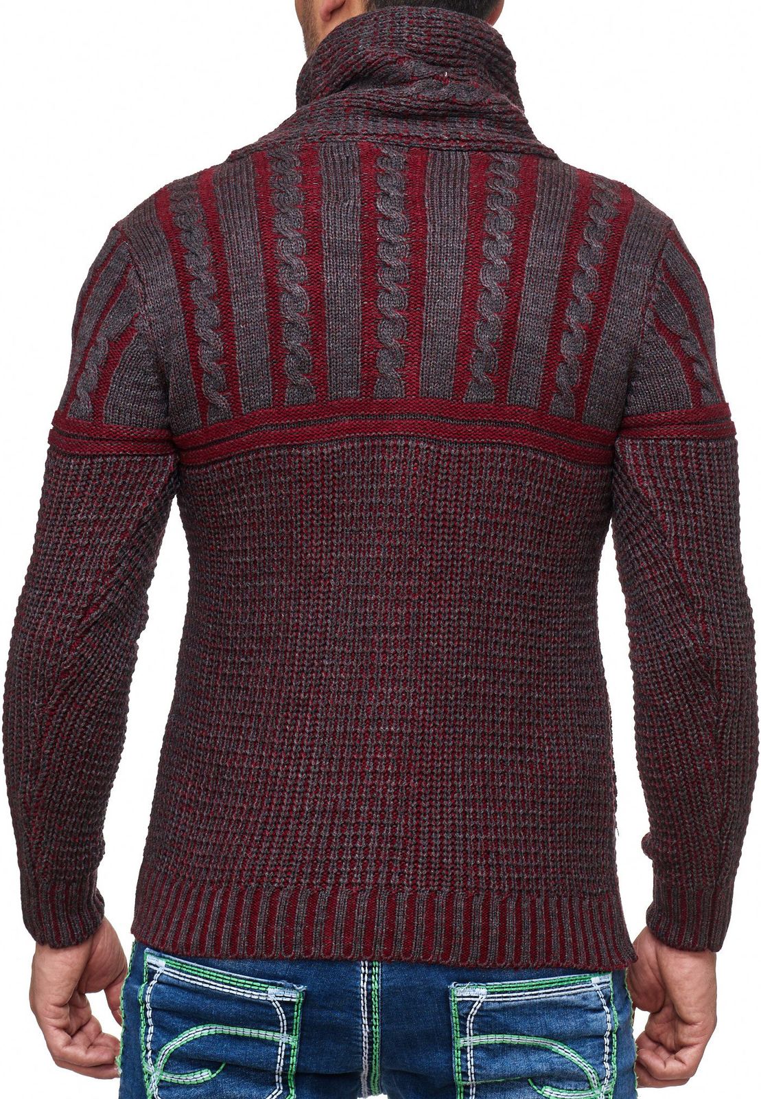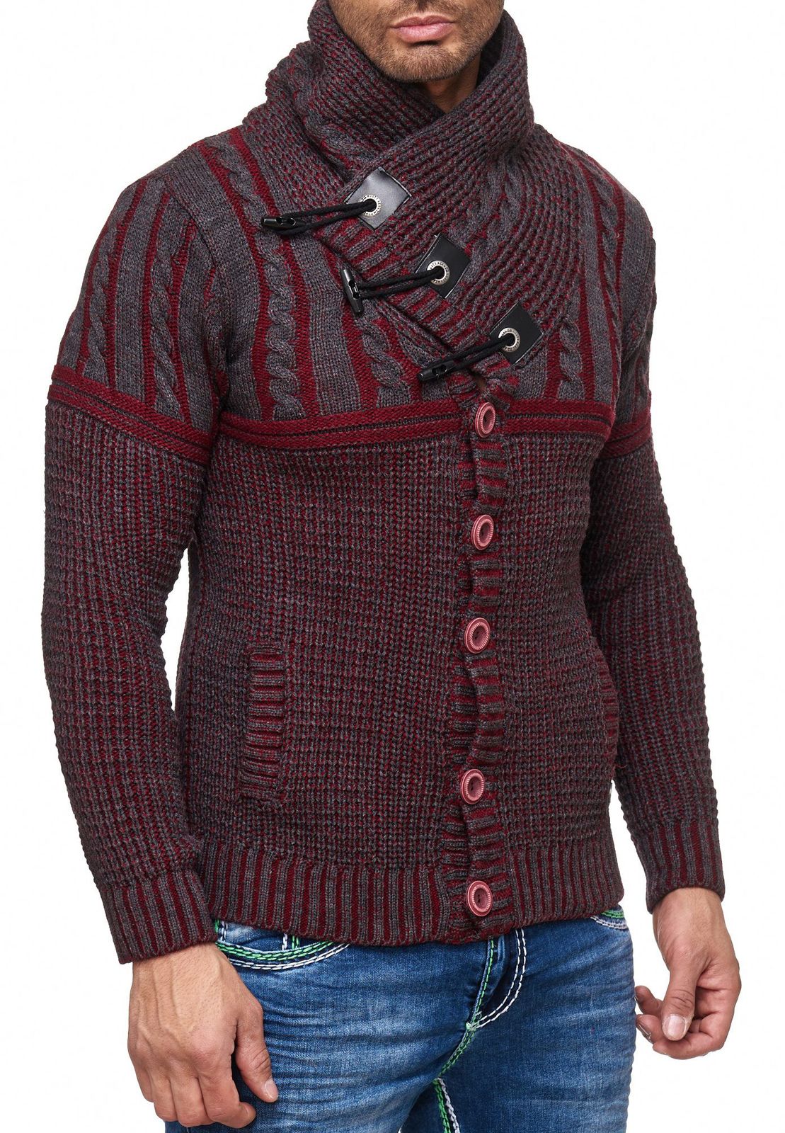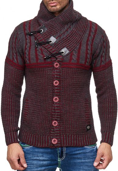 Stylish men's chunky knit sweater with stand-up collar and toggle closure, contrast knit sweater 13288 Bordeaux