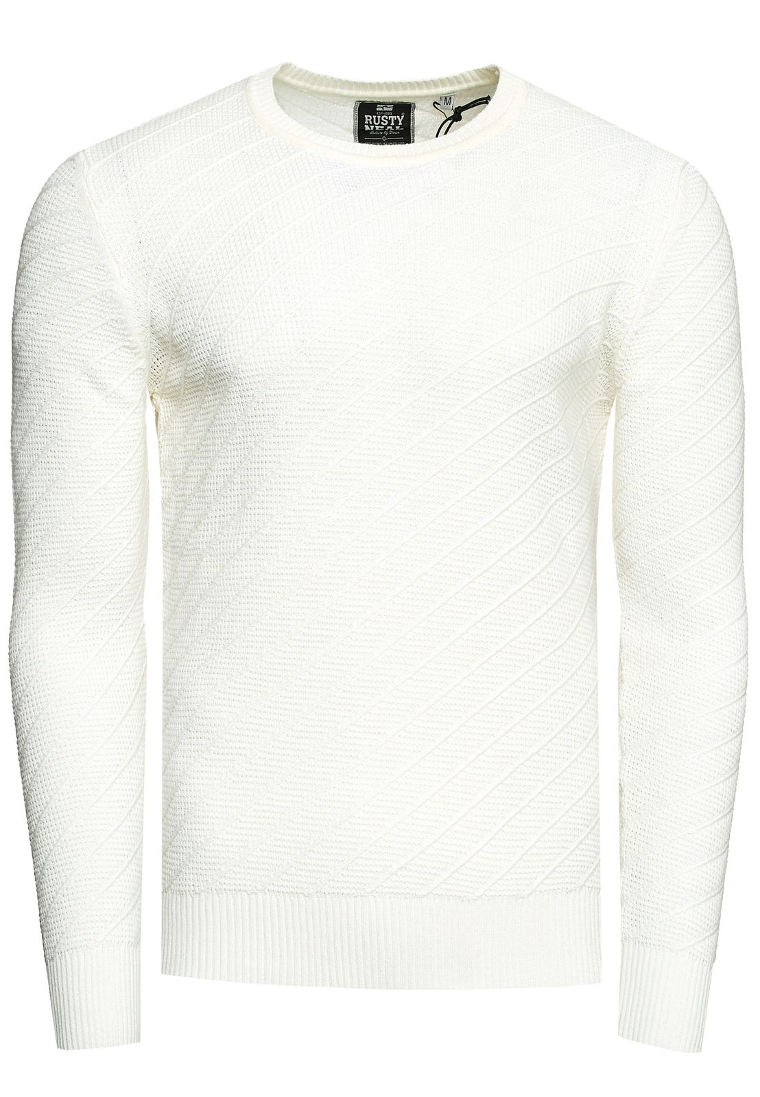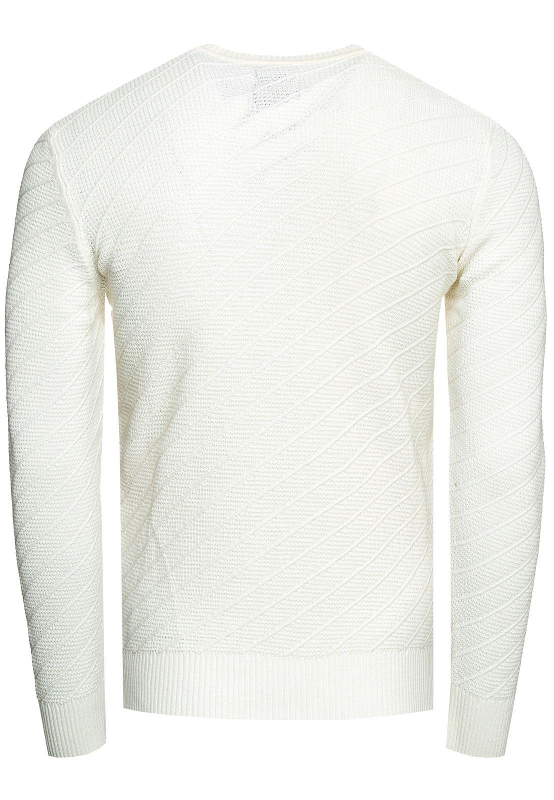 Stylish men's fine-knit sweater with diagonal textured pattern, crew neck sweater 13374 White