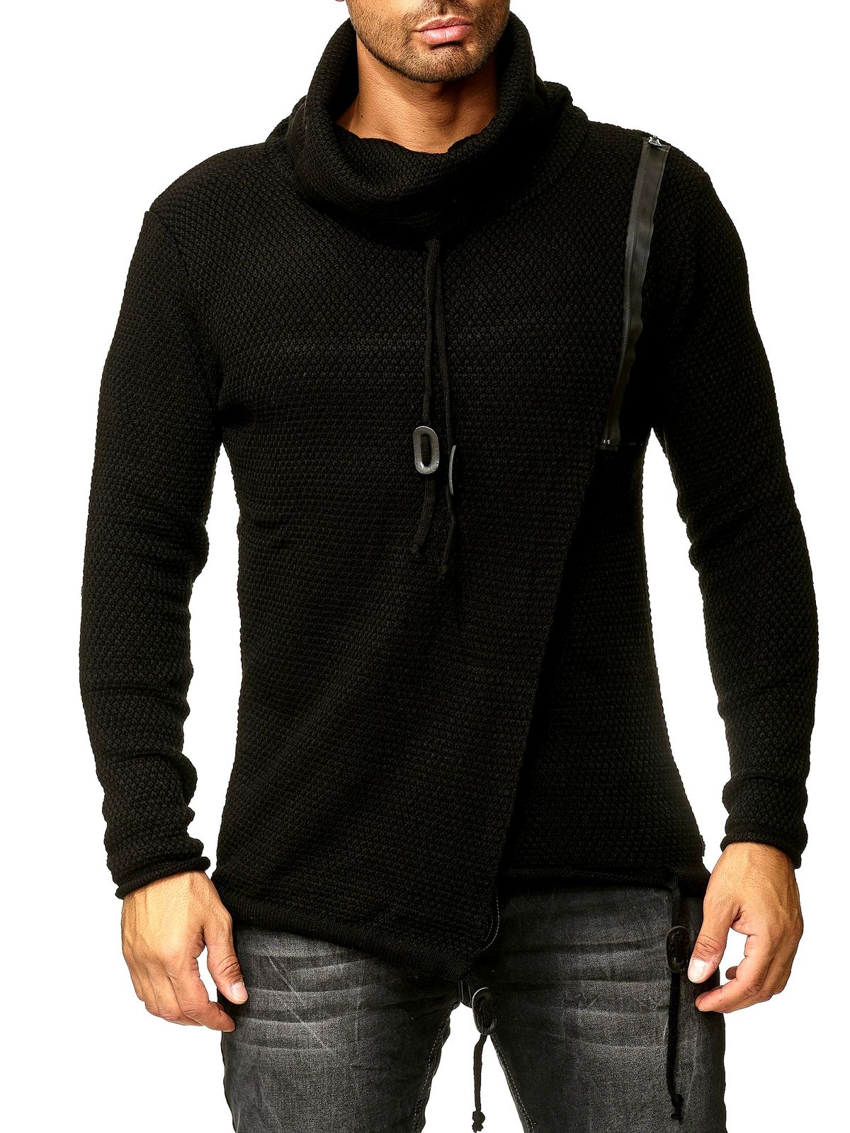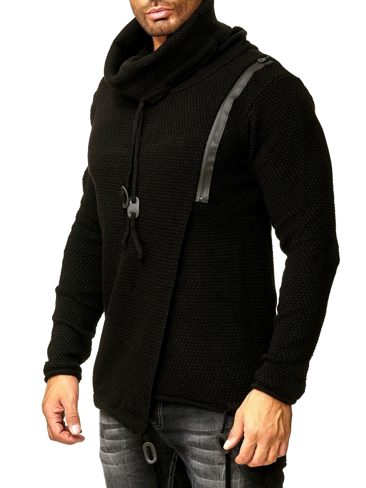 Stylish men's knit sweater with shawl collar and zipper detail, oversized look, 13336, black