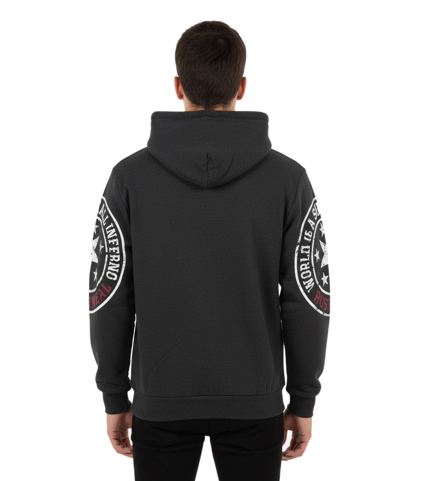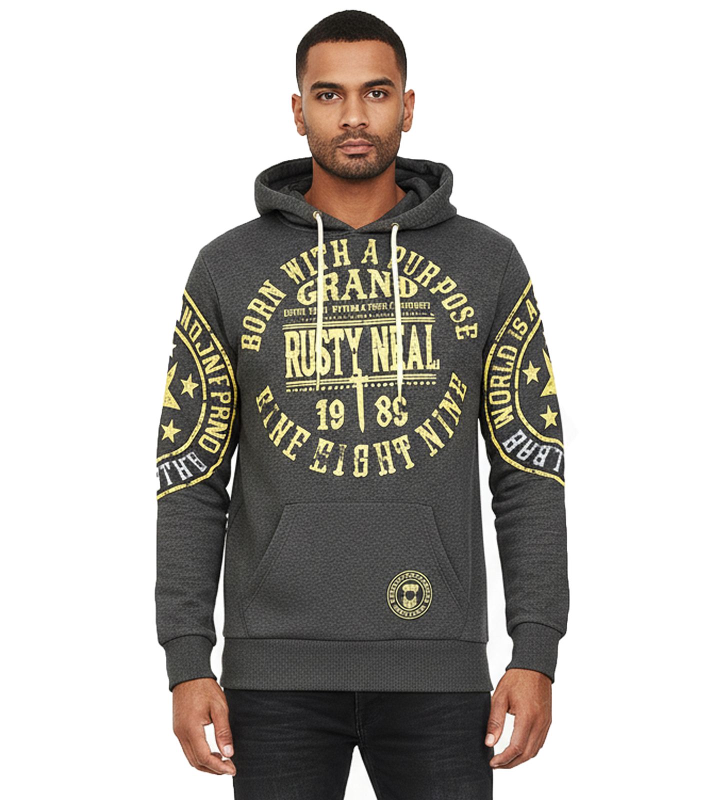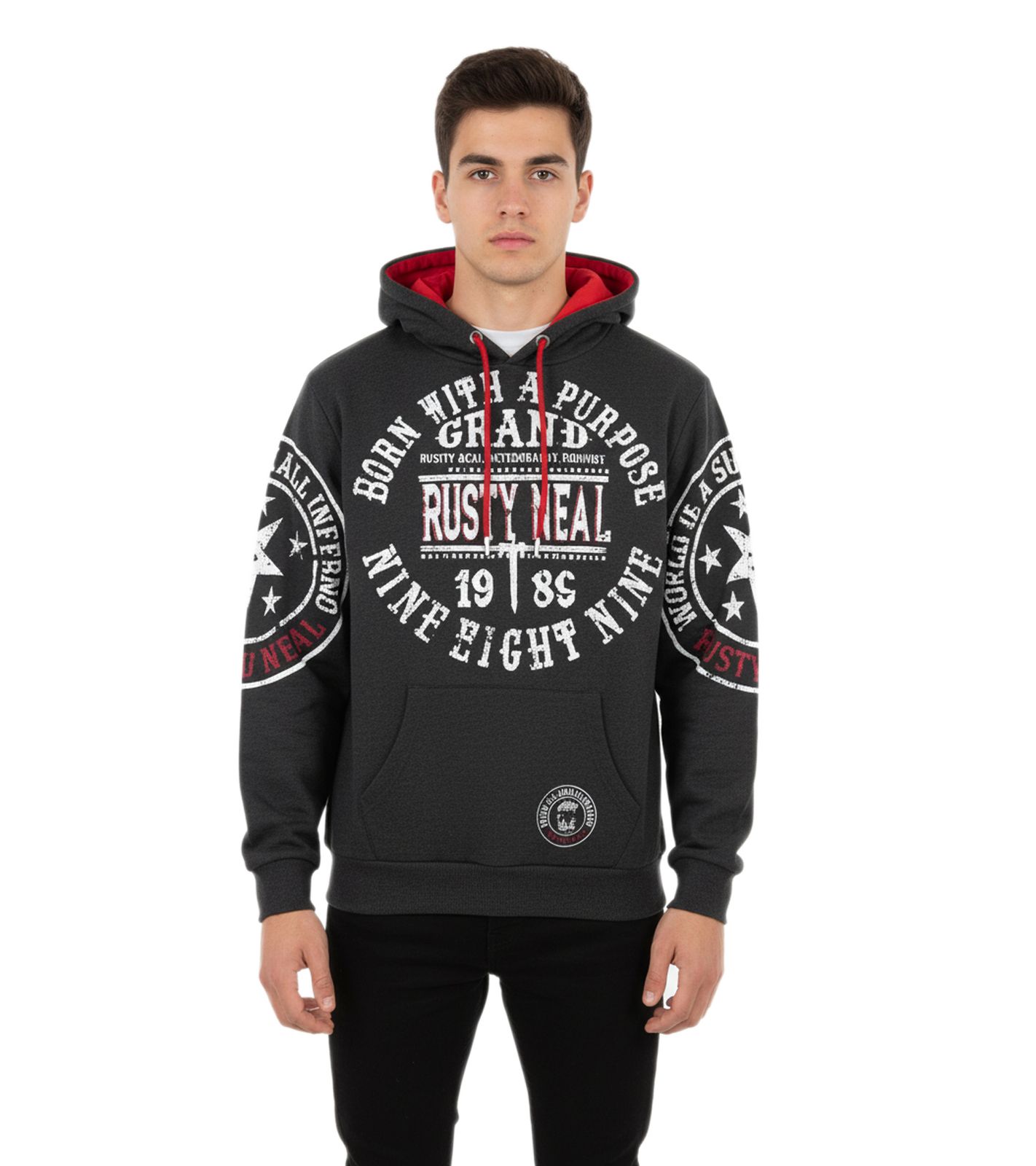 This trendy men's hoodie features cool brand prints on the front and sleeves.
