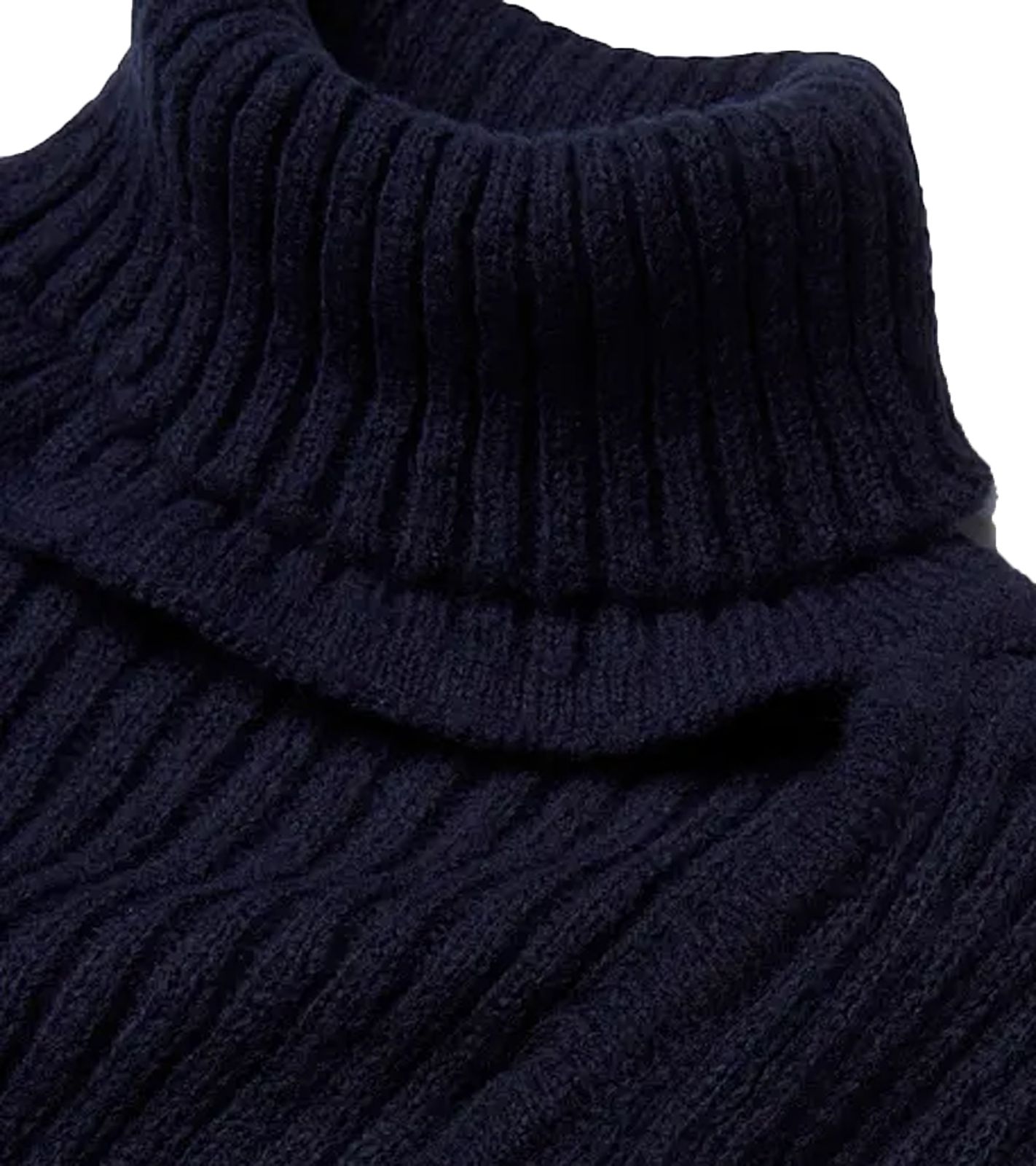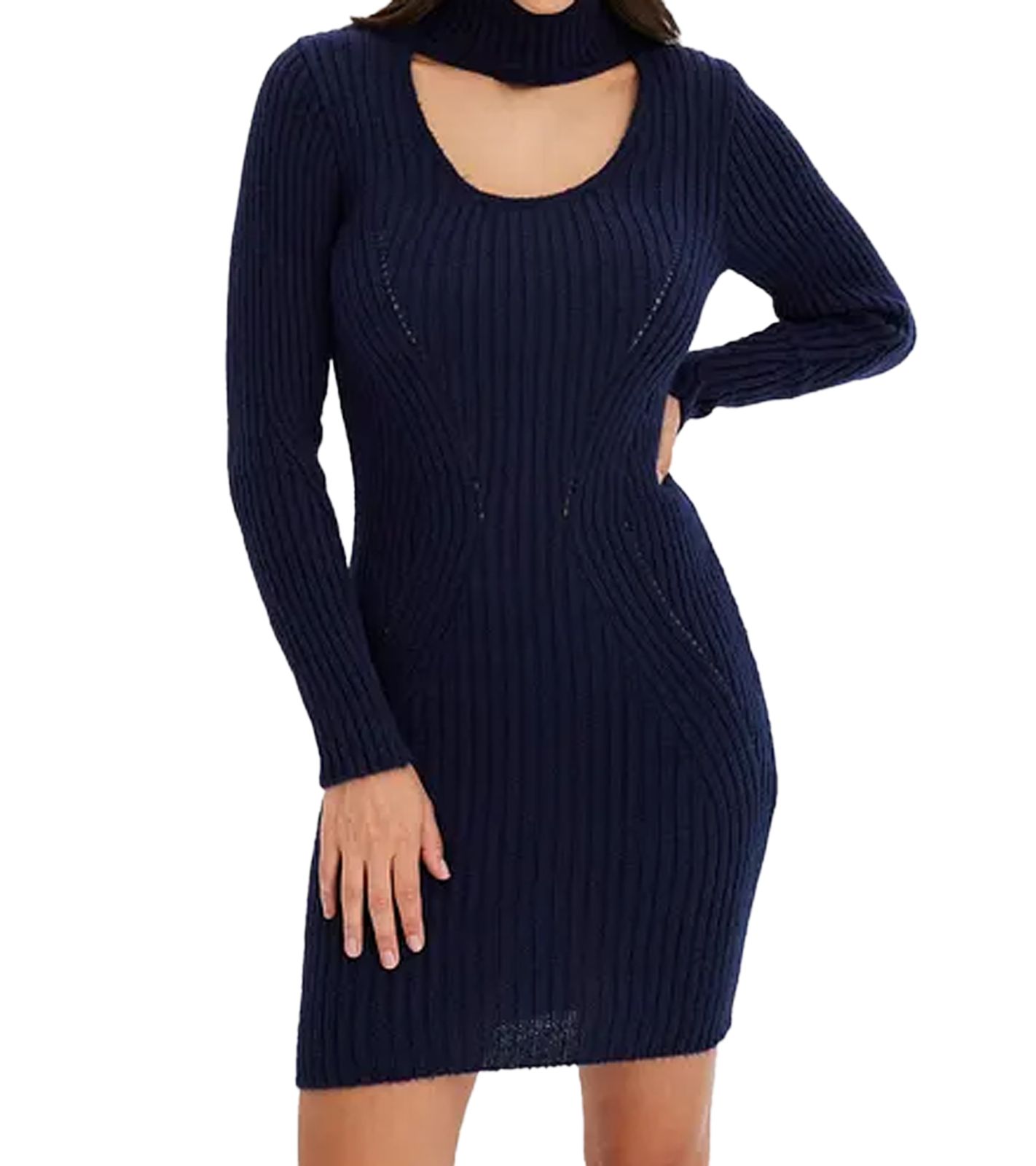 Women's Knit Mini Dress with Turtleneck and Neckline Details, Long Sleeve, Mahogany Brown or Dark Blue