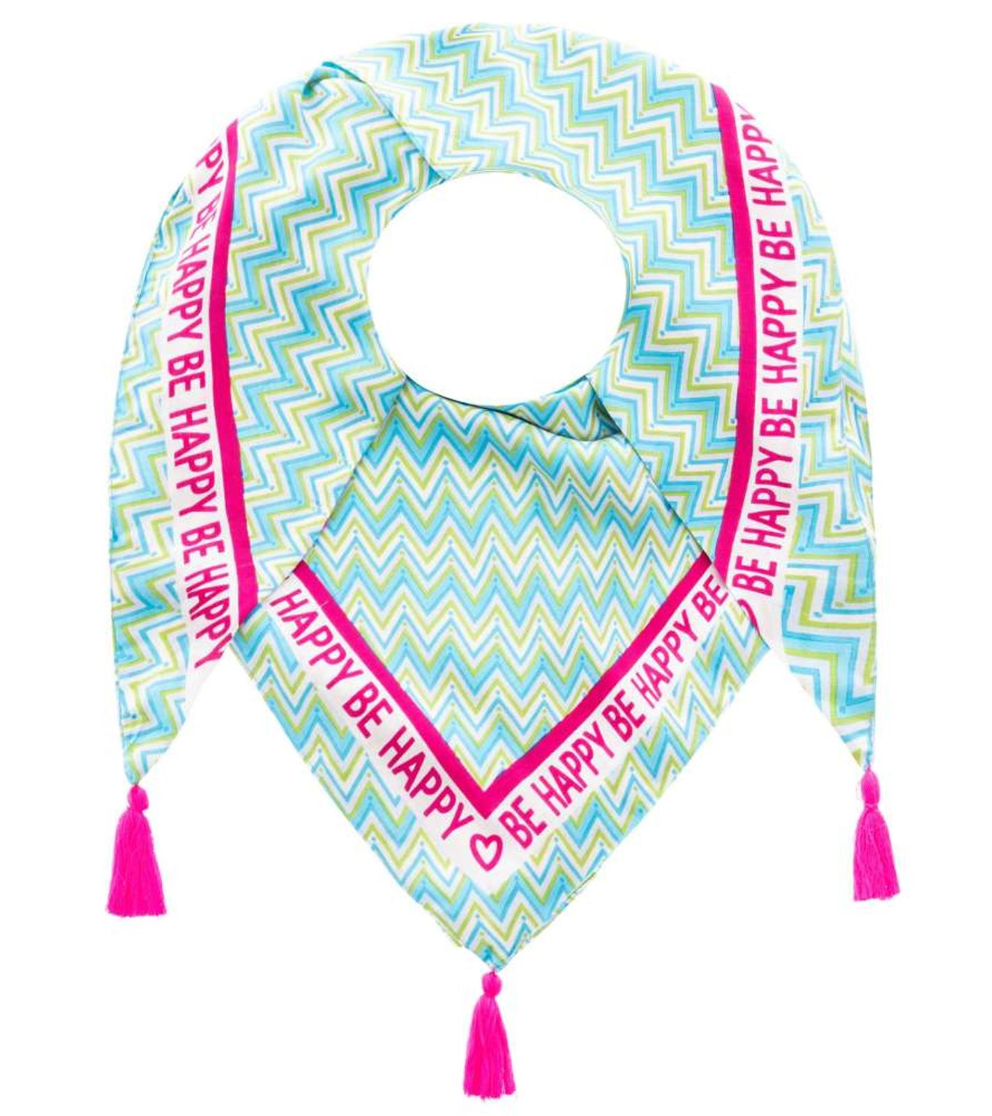 ZWILLINGSHERZ Zigzag Triangle Scarf with Zigzag Pattern and Be Happy Print, Fashion Scarf 3014D-0204-88 Turquoise/Green/Pink