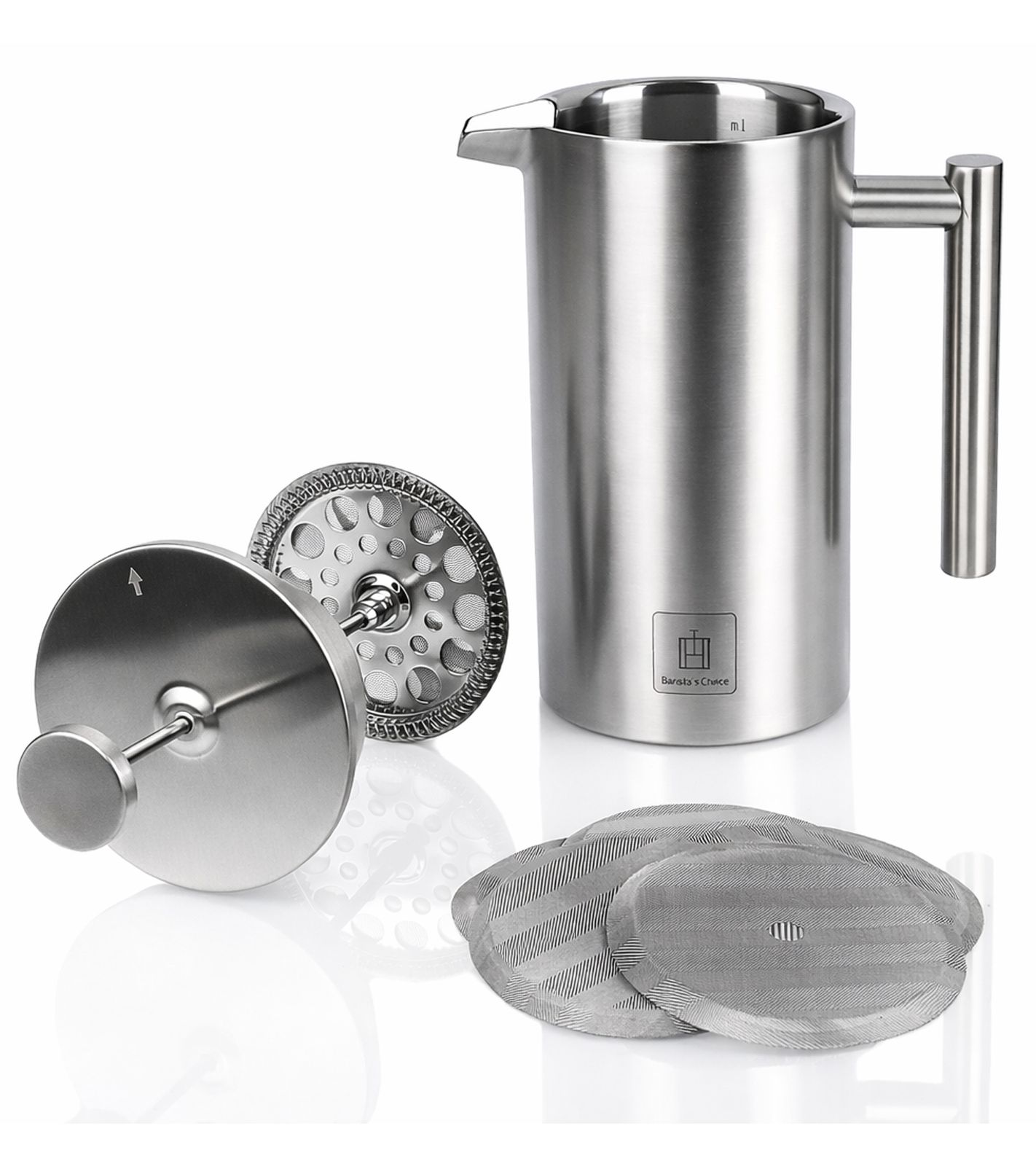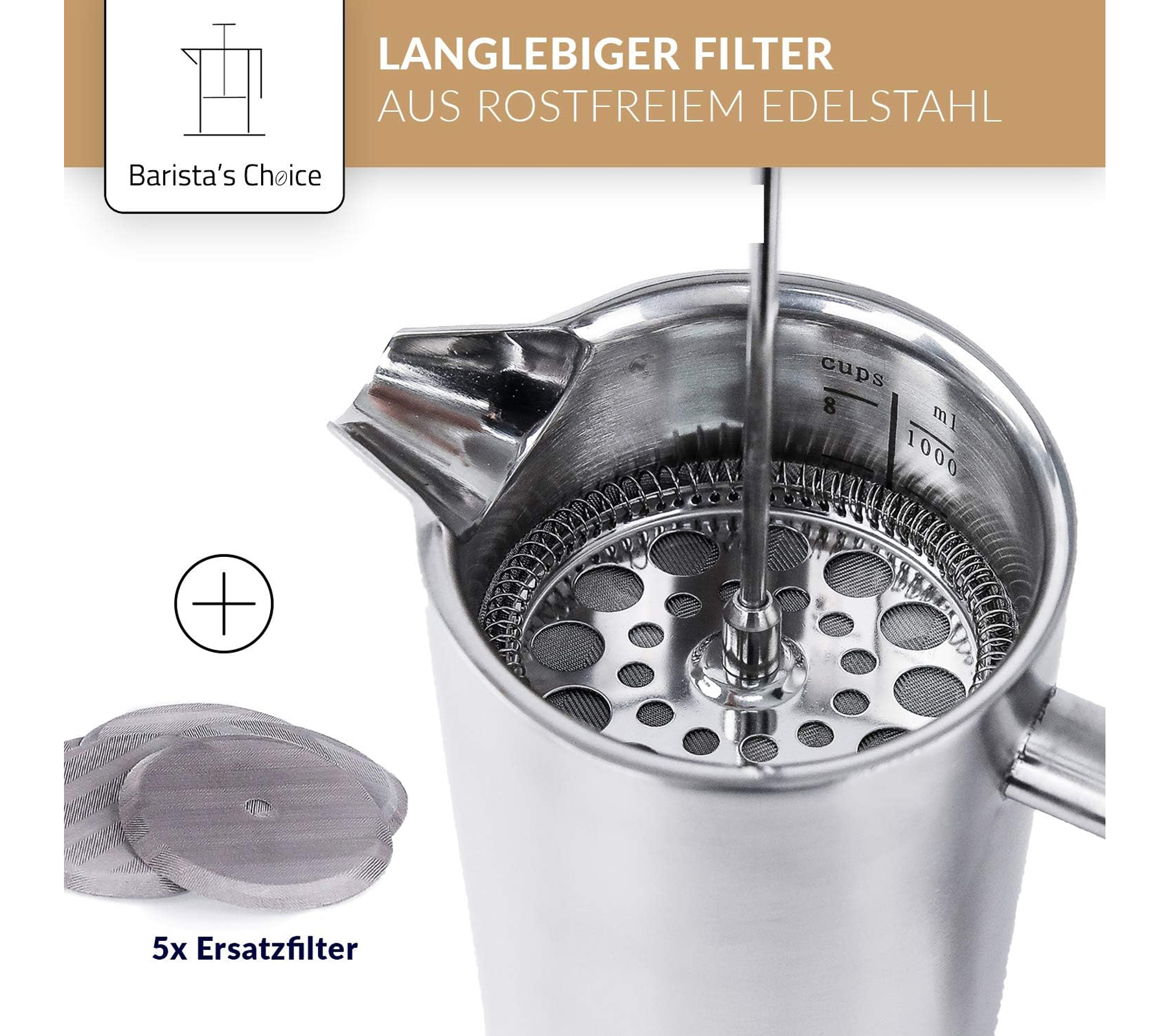 Cafetera de prensa francesa de acero inoxidable Barista’s Choice, con aislamiento de doble pared – Cafetera de filtro para café aromático, 1 litro, plateada