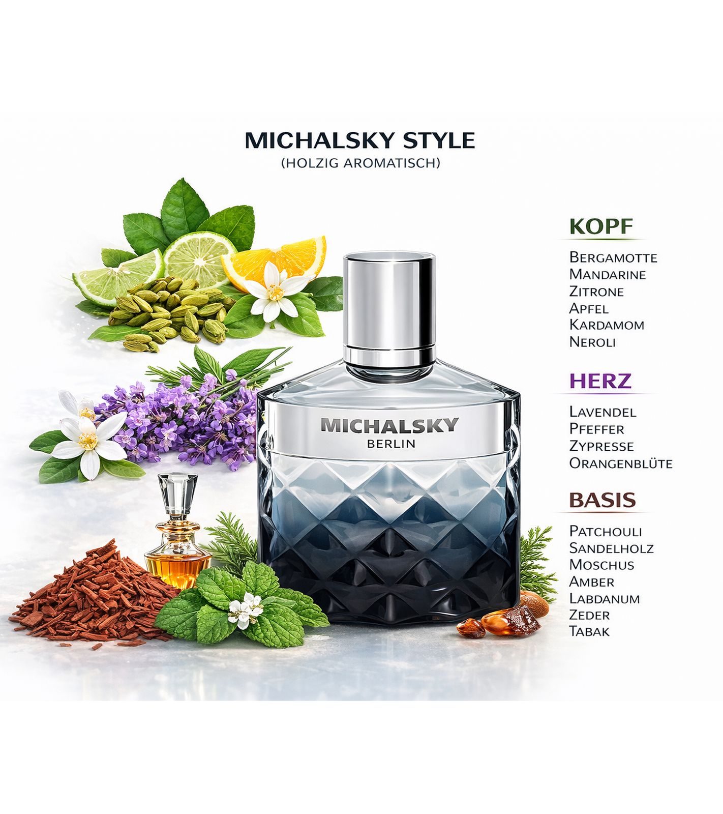 Carismática fragancia corporal MICHALSKY Berlin Style for Men Eau de Toilette en un elegante frasco de 30 ml.