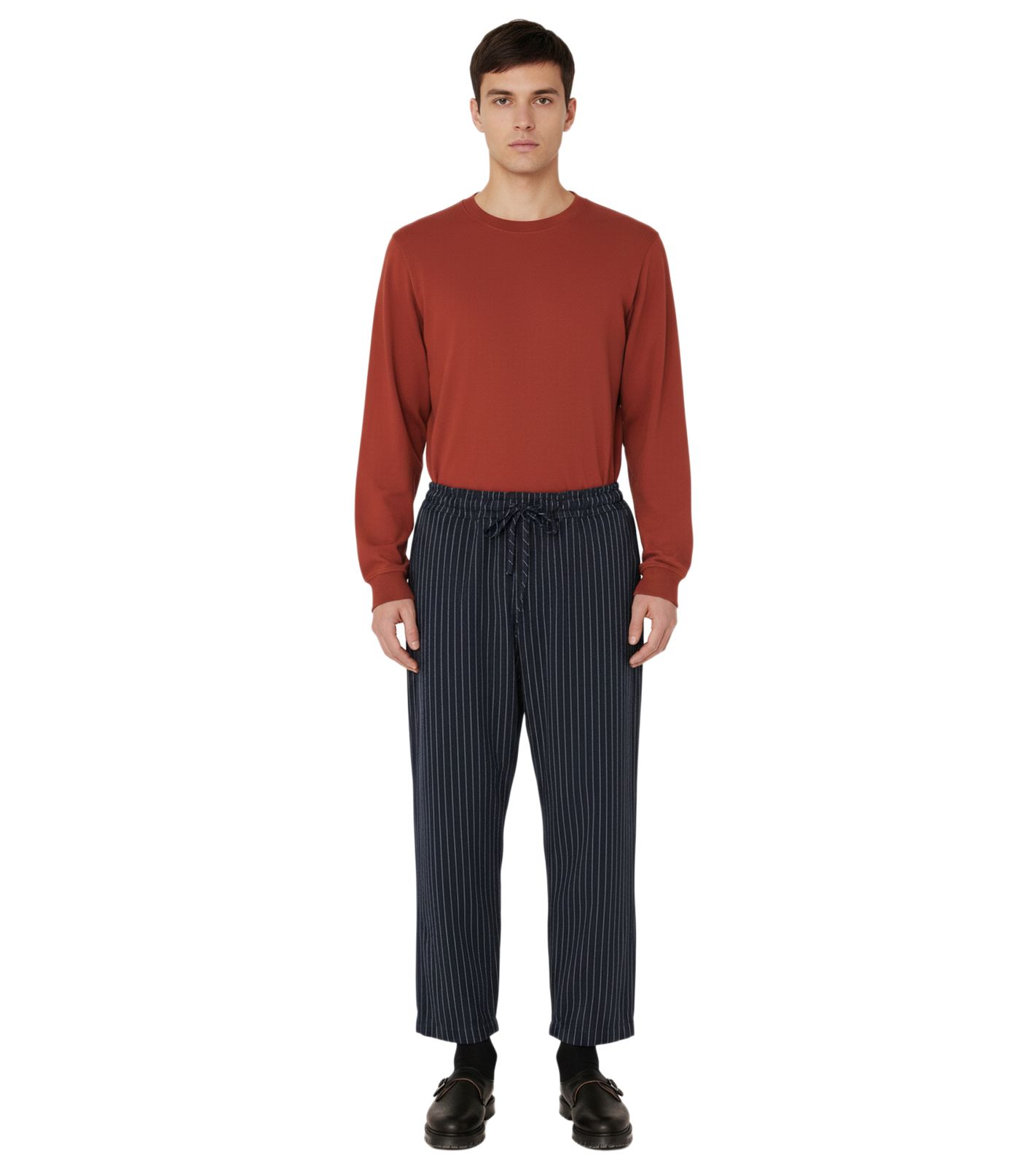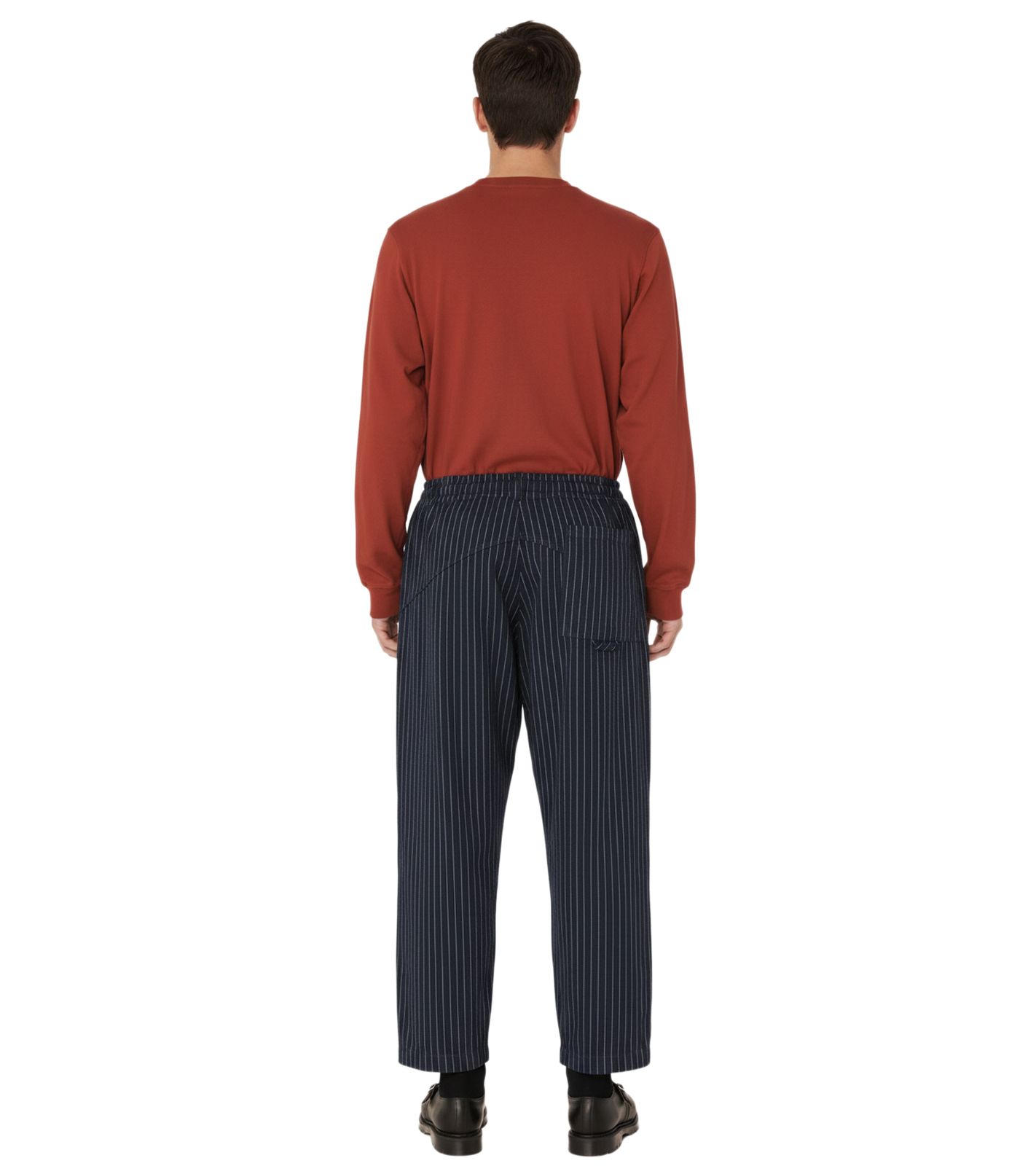 - Moderna silueta de skate, pantalones de corte relajado para hombre inspirados en la ropa clásica de skate combinada con sastrería contemporánea.