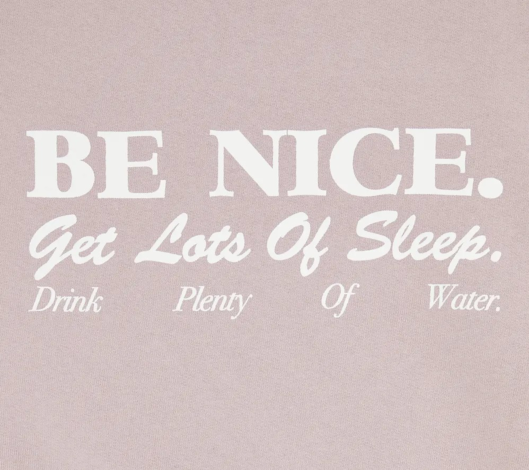 Sudadera de alta calidad de Sporty & Rich en color rosa pastel/blanco con un llamativo estampado "Be Nice". Fabricada en EE. UU. con 100 % algodón y forro polar para una máxima comodidad: la prenda perfecta para el día a día.