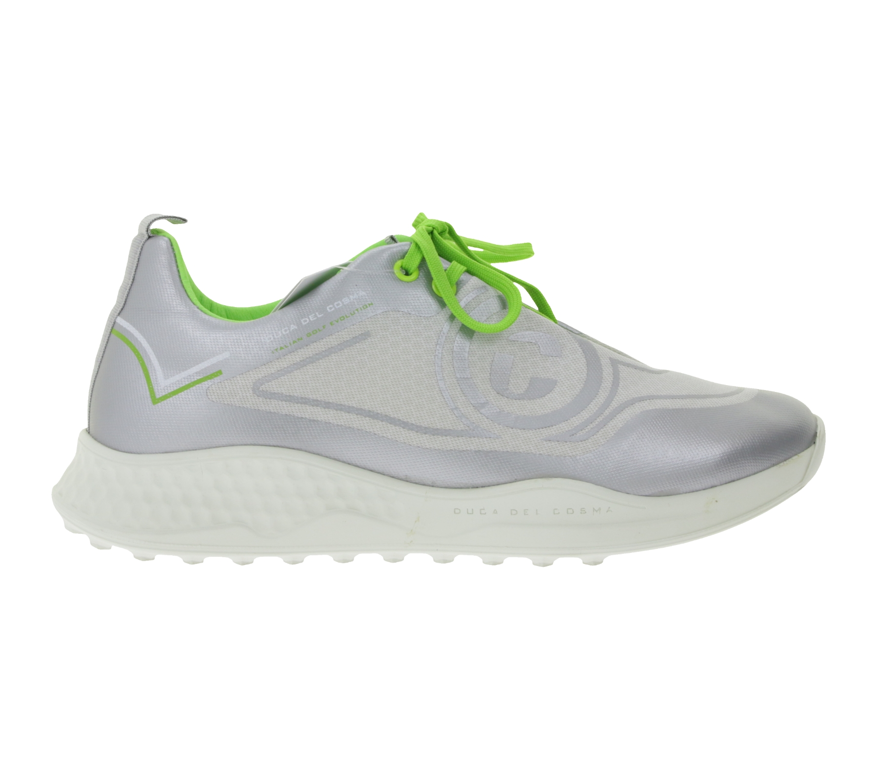 El Duca del Cosma Wildcat Silver es un zapato de golf impermeable para mujer con un diseño elegante, comodidad superior y una suela con agarre para una pisada segura en el campo.
