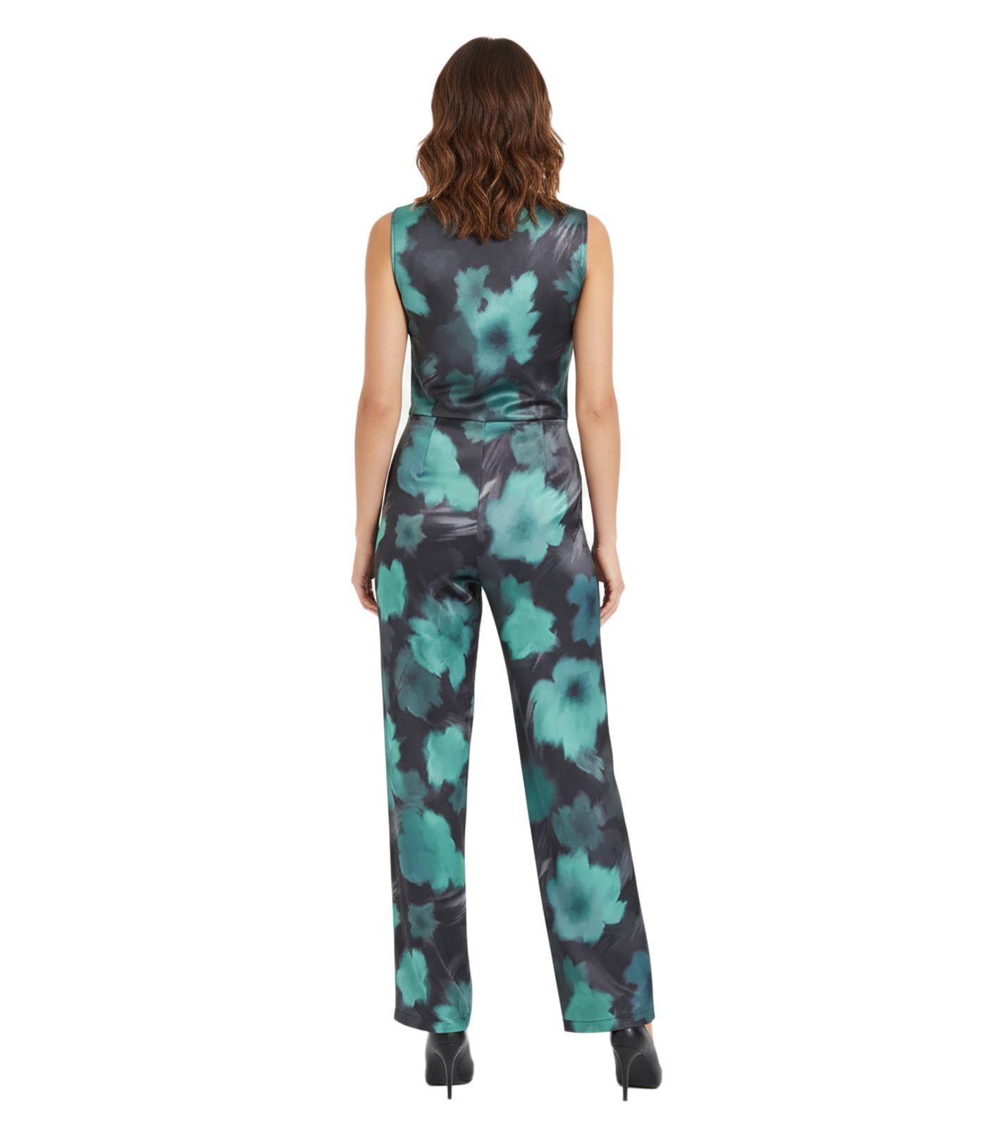 - Dieser elegante Jumpsuit aus glänzendem Satin besticht durch sein ärmelloses Oberteil, den Wasserfallausschnitt, die Schulterknöpfe und den lebendigen Blumenprint