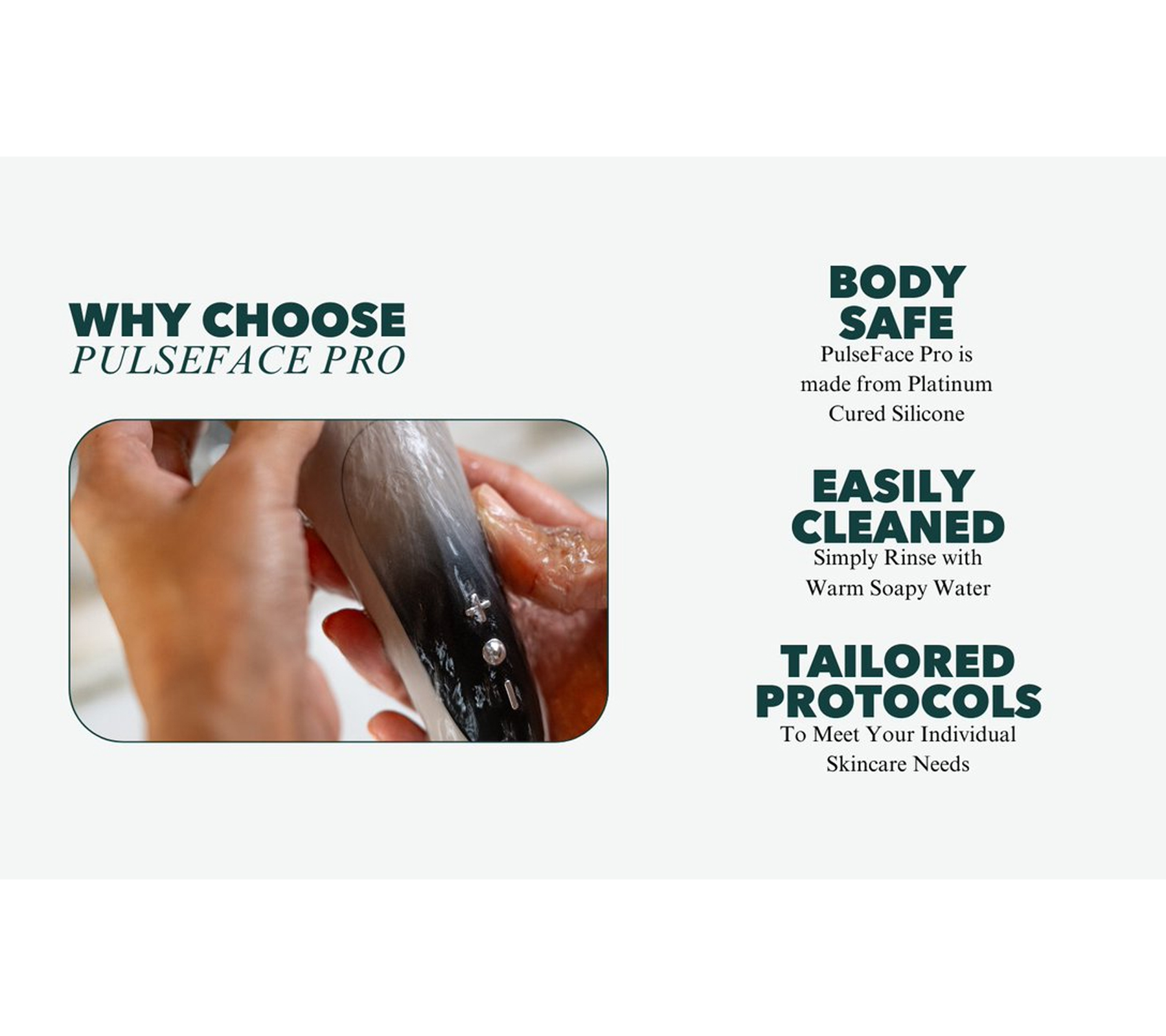 Le PulseFace Pro allie technologie brevetée et soins de la peau modernes. Grâce à ses fonctionnalités testées cliniquement et à ses protocoles personnalisables, l'appareil s'adapte à vos besoins individuels. Le silicone platiné hypoallergénique est particulièrement doux pour la peau du visage, compatible avec le corps et facile à nettoyer. Son étanchéité permet d'utiliser le PulseFace Pro sous la douche ou dans le bain.
