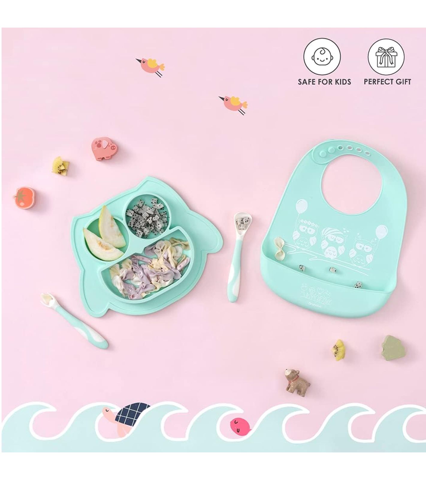 Assiette bébé antidérapante en silicone Brunoko, ensemble 3 en 1 comprenant : assiette, cuillère et bavoir avec rebord en silicone, sans BPA, rose ou vert menthe
