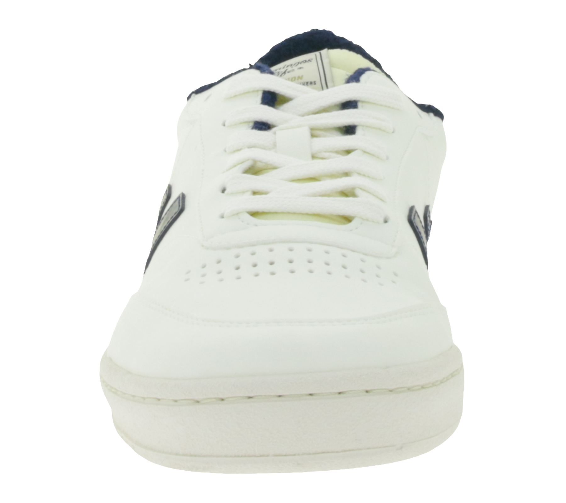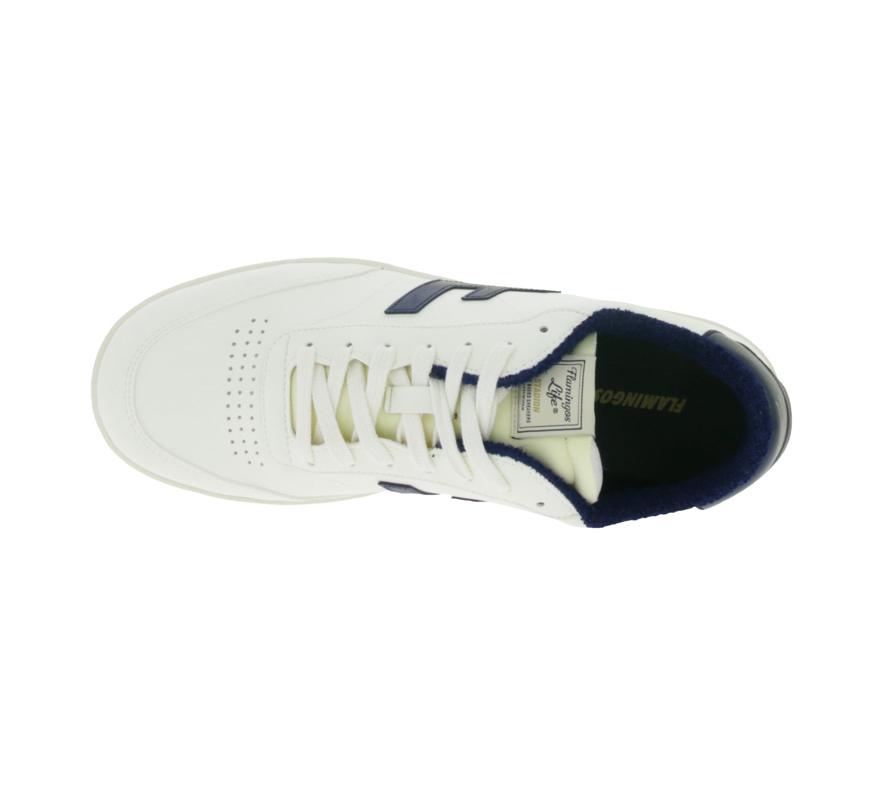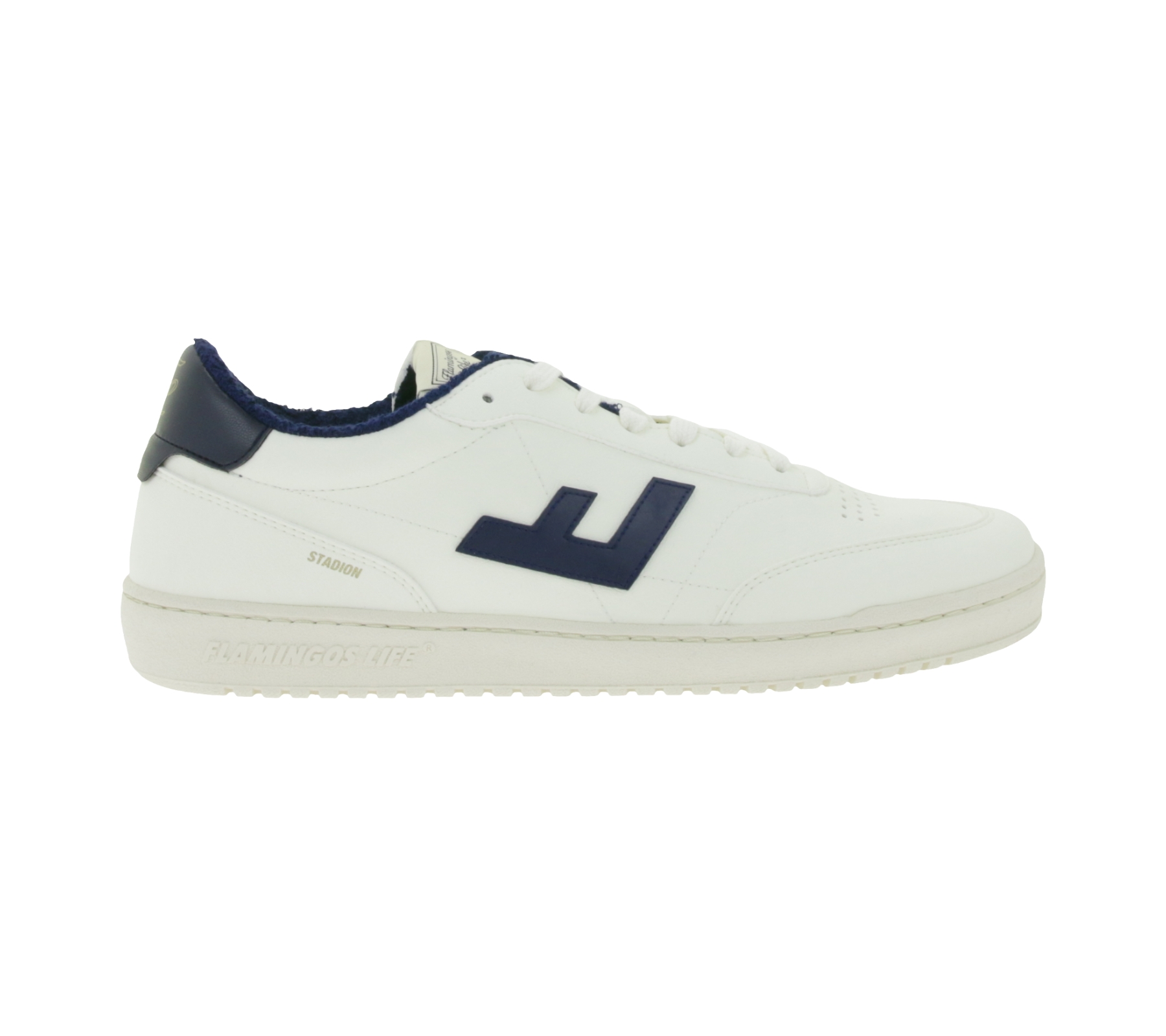 Baskets basses vegan FLAMINGOS LIFE Stadium pour homme et femme, beige/bleu foncé, fabriquées en Espagne.
