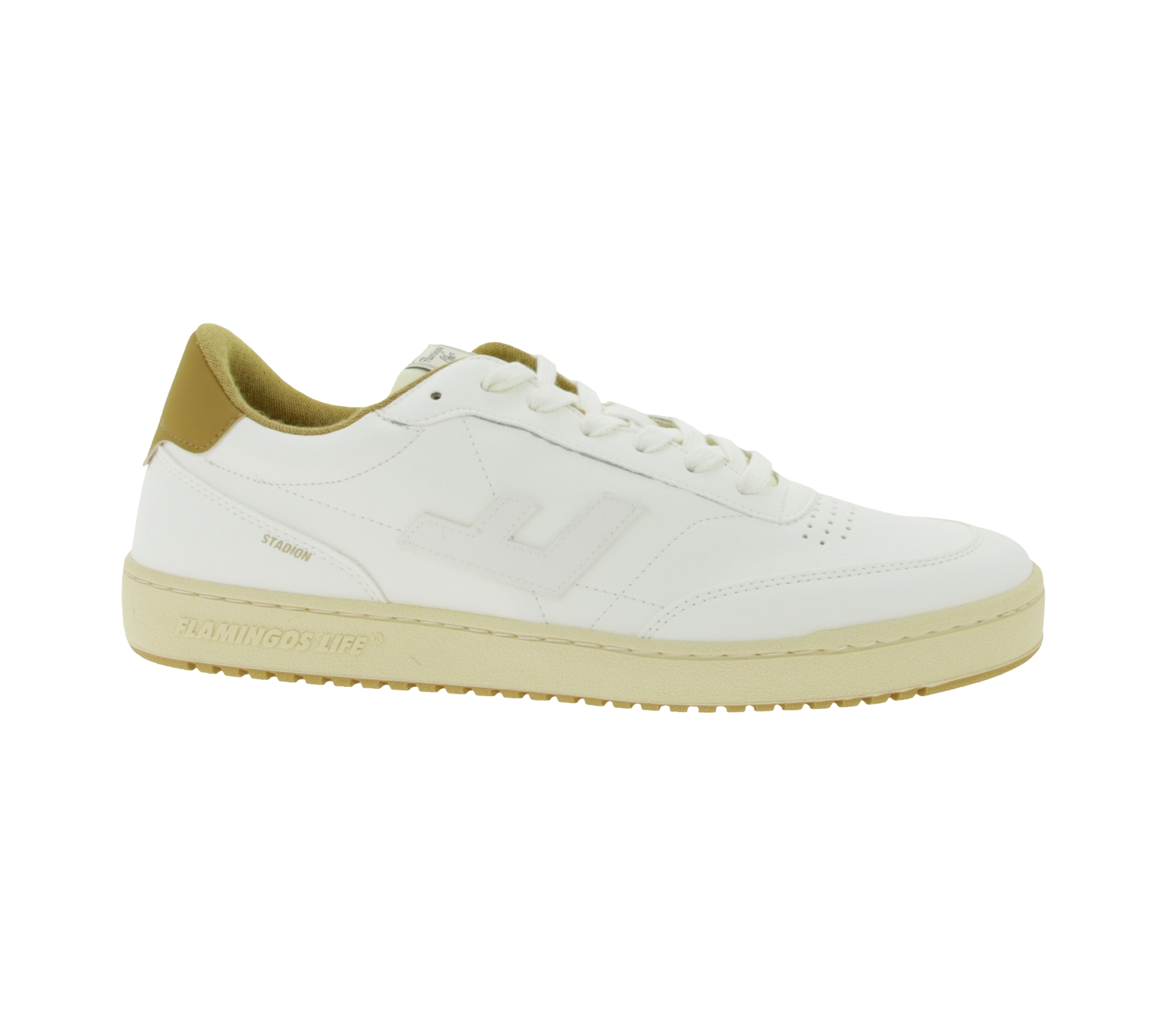 Baskets basses vegan FLAMINGOS LIFE Stadium pour homme et femme, beige/marron, fabriquées en Espagne.
