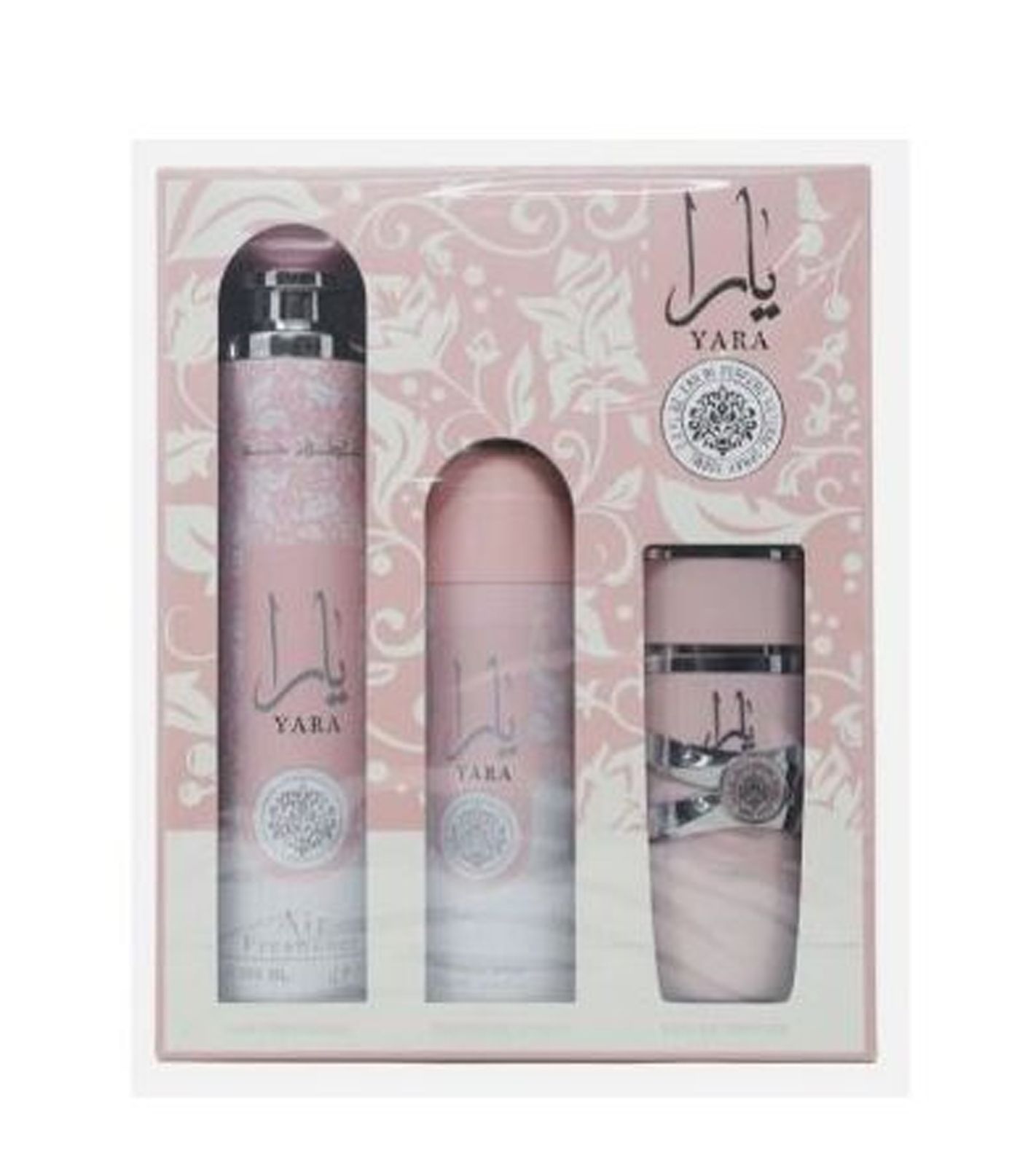 Contenu : 1 x Désodorisant d'ambiance Lattafa Yara (300 ml), 1 x Spray parfumé pour le corps Lattafa Yara (200 ml), et 1 x Eau de Parfum Lattafa Yara (100 ml)