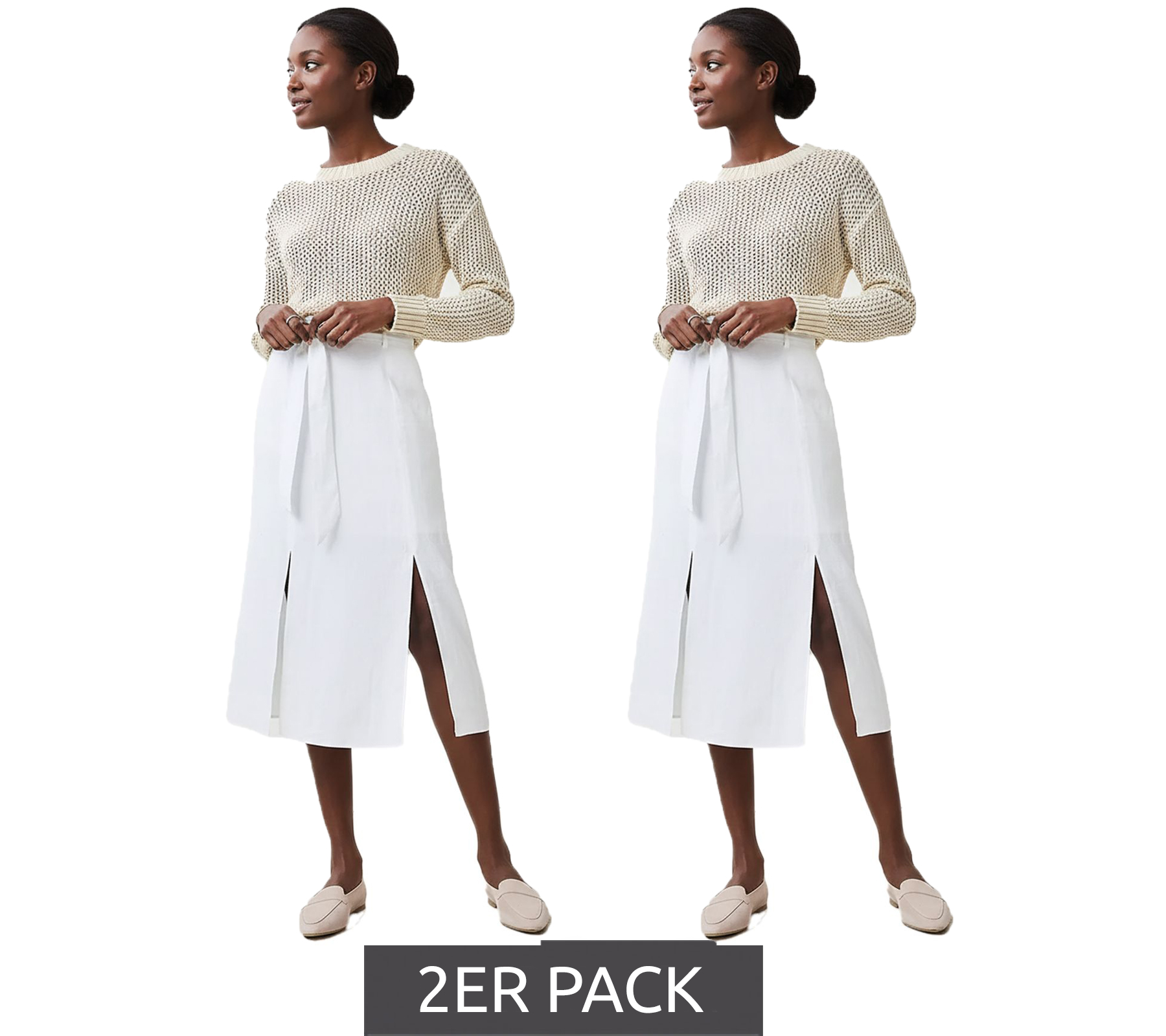 Lot de 2 jupes d'été romantiques pour femme, avec ceinture à nouer, jupe midi en pur lin blanc 905991